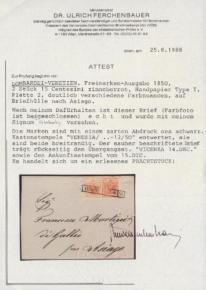 | Zusatzinformationen und Suchstichworte: | 16. Auktion Stilus 6. August 2023 Los 1435 Österreich Lombardei Venetien Österreich, LV, 1850, Venetien, Venezia, ANK-Nr. 3 H I, 15 Centesimi, 'rot', 2 Stk. in deutlich unterschiedlichen Farbnuancen, Kastenstempel von; 'VENEZIA', Müller 259e = 12 Punkte, Sassone 5 Punkte, auf Faltbriefhülle nach Asiago, Ankunftsstempel, einwandfrei Ausruf 140,00 EUR |