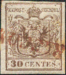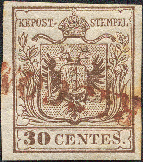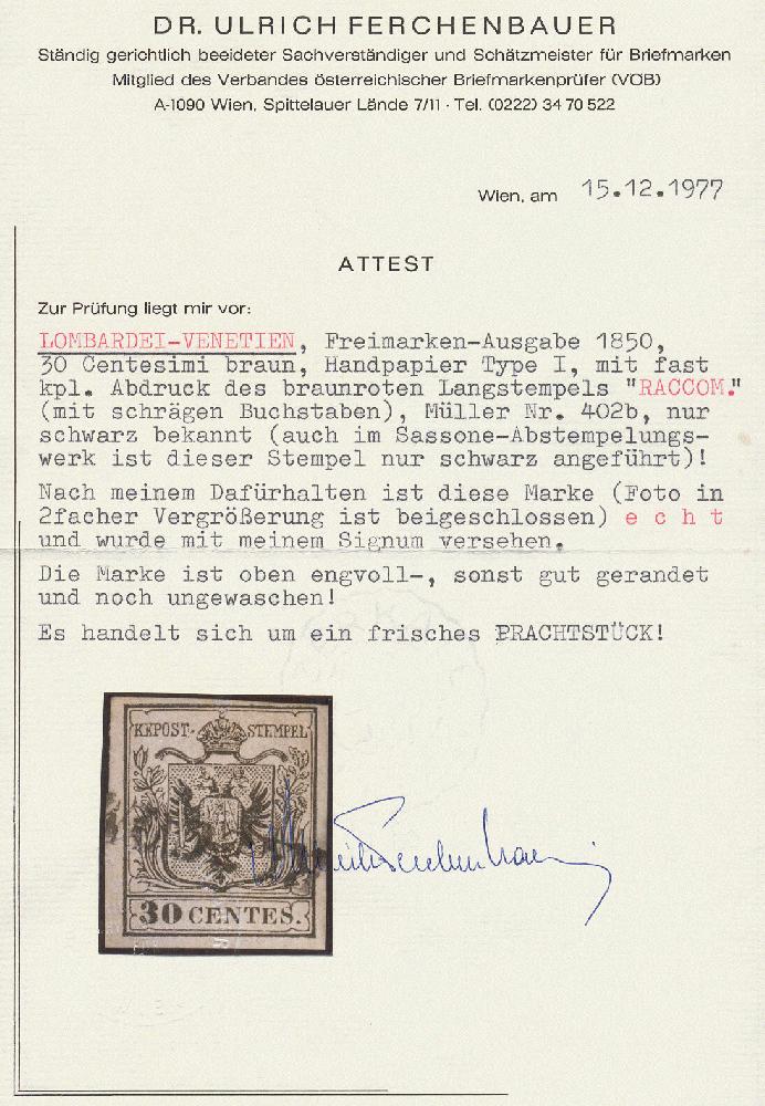 | Zusatzinformationen und Suchstichworte: | 16. Auktion Stilus 6. August 2023 Los 1448 Österreich Lombardei Venetien Österreich, LV, 1850, Raccom, ANK-Nr. 4 H I, 30 Centesimi, 'braun', nahezu kompletter roter Einzeiler; 'RACCOM', im Müller & Sassone nicht gelistet, ungewaschen, einwandfreie Erhaltung, sehr selten Ausruf 650,00 EUR |