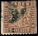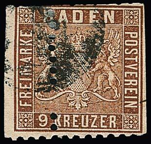 | Zusatzinformationen und Suchstichworte: | Rauhut & Kruschel - 219. Auktion 29. Juli 2023 Los 104 Altdeutschland Baden 9 Kr. dunkelbraun, extrem verzähntes gestempeltes Exemplar, siehe Foto, durch den Zähnungsverlauf zwangsweise teils Scherentrennung, mittig nur teilweise (!) gezähnt mit teils ausgefallener Zähnung, in vorliegender Form sehr ungewöhnlich und nur wenige Exemplare bekannt Ausruf 180,00 EUR |