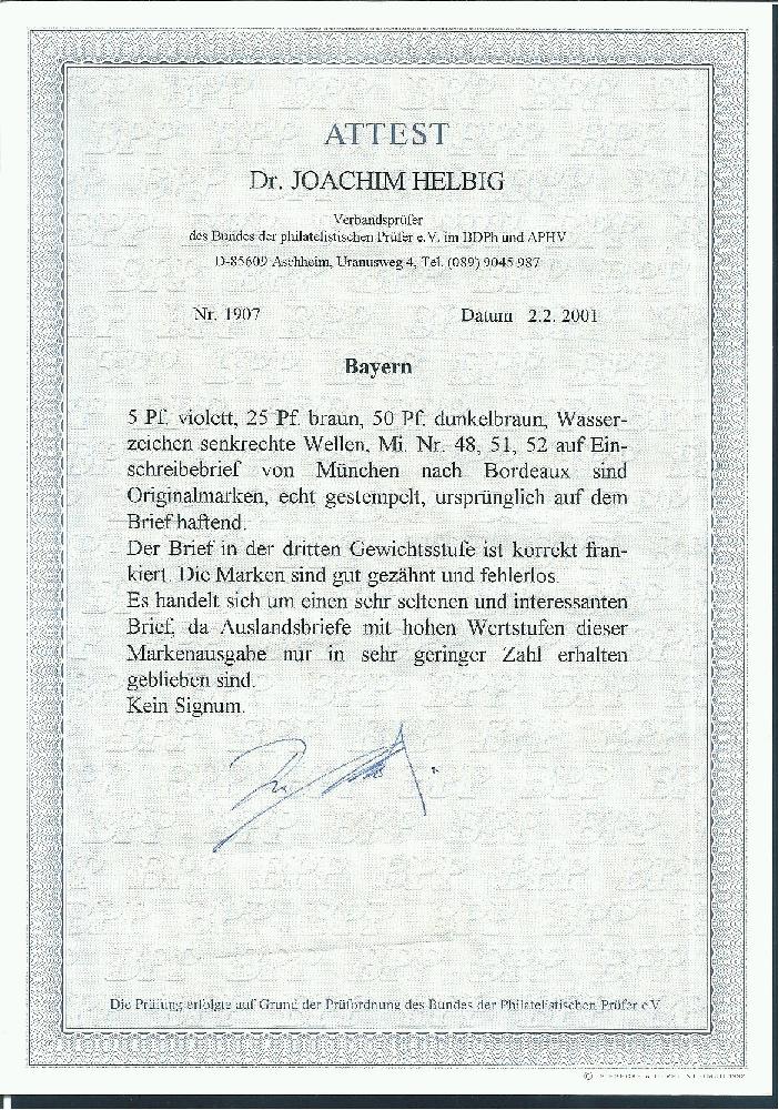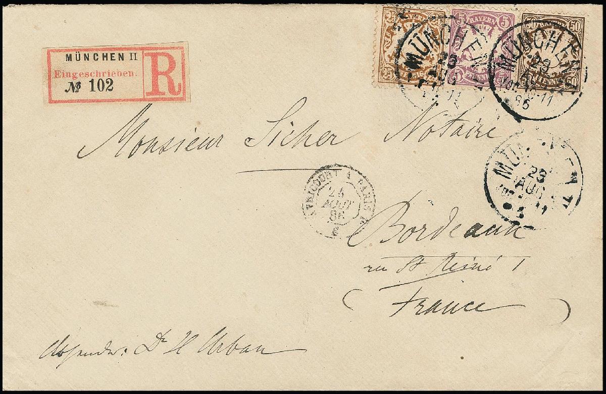 | Zusatzinformationen und Suchstichworte: | Rauhut & Kruschel - 219. Auktion 29. Juli 2023 Los 271 Altdeutschland Bayern 5 Pfg. purpur, 25 Pfg. braun und 50 Pfg. dunkelbraun auf tadellosem Einschreibebrief der 3. Gewichtsstufe von München 1886 nach Frankreich. Seltene Frankatur Ausruf 180,00 EUR |