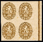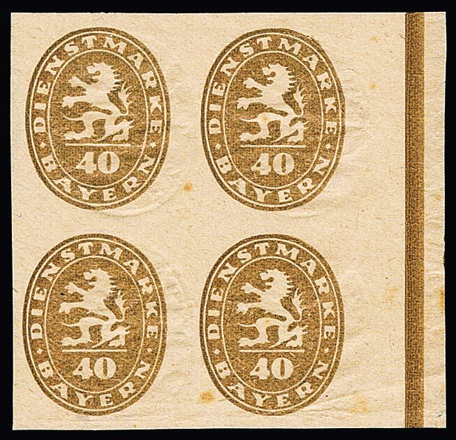 | Zusatzinformationen und Suchstichworte: | Rauhut & Kruschel - 219. Auktion 29. Juli 2023 Los 367 Altdeutschland Bayern 40 Pfg. Abschied, Probedruck in ockerbraun im ungezähnten Rand-Viererblock mit seltenem Doppeldruck, davon einer farblos. Ein Wert punkthelle Stelle und leichter Bug, seltene Probedruck-Variante, lt. Attest Helbig bisher nur zweimal registriert Ausruf 70,00 EUR |