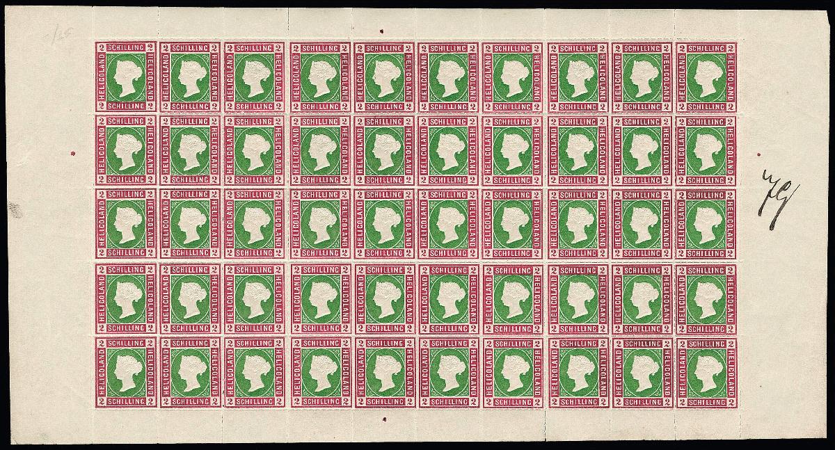 | Zusatzinformationen und Suchstichworte: | Rauhut & Kruschel - 219. Auktion 29. Juli 2023 Los 673 Altdeutschland Helgoland 2 Sch., vollständiger postfrischer Originalbogen inkl. Plattenfehler II. Attest C. Brettl. Mi. lose 1325,- ++. Für den Druck wurden zwei Stahlstempel graviert, einer für das Mittelmedaillon mit den Ecken, einer für den Rahmen. Davon wurde wiederum eine Druckplatte mit 50 Druckstöcken erzeugt. Die Rahmenplatte und die Mittelplatte wurden aus sechs Galvanogruppen zusammengestellt. Der bekannteste Plattenfehler ist in Feld 1 die "kurze 2". Das Feld hat folgende weitere Fehler: Rechts von der 2 ist das "S" größer, das folgende "C" größer und breiter als sonst. An dem folgenden "H" ist oben rechts eine weiße Fehlstelle. Eine ähnliche Fehlstelle ist über der zweiten Fußlinie des "L" sichtbar. Die zweite "2" ist fetter gedruckt als alle anderen. Das Ganze macht den Eindruck, als ob sich die obere Rahmenleiste des Druckstockes fehlerhaft abgedruckt hat. Bei den Neudrucken ist der besagte Plattenfehler auf Feld 21, das heißt, die Gruppengalvanos wurden für die Neudrucke neu gesetzt. Die restlichen vorhandenen Helgoländer Originalbogen kaufte der Hamburger Briefmarkenhändler Julius Goldner nach Übergabe an die Reichspost. Einige wenige Bögen wurden von ihm mit seinem Monogramm "J.G." (= Julius Goldner) signiert. Hiervon sind nur noch ganz wenige Bögen existent. Am Rand ganz minimal angetrennt Ausruf 600,00 EUR |