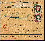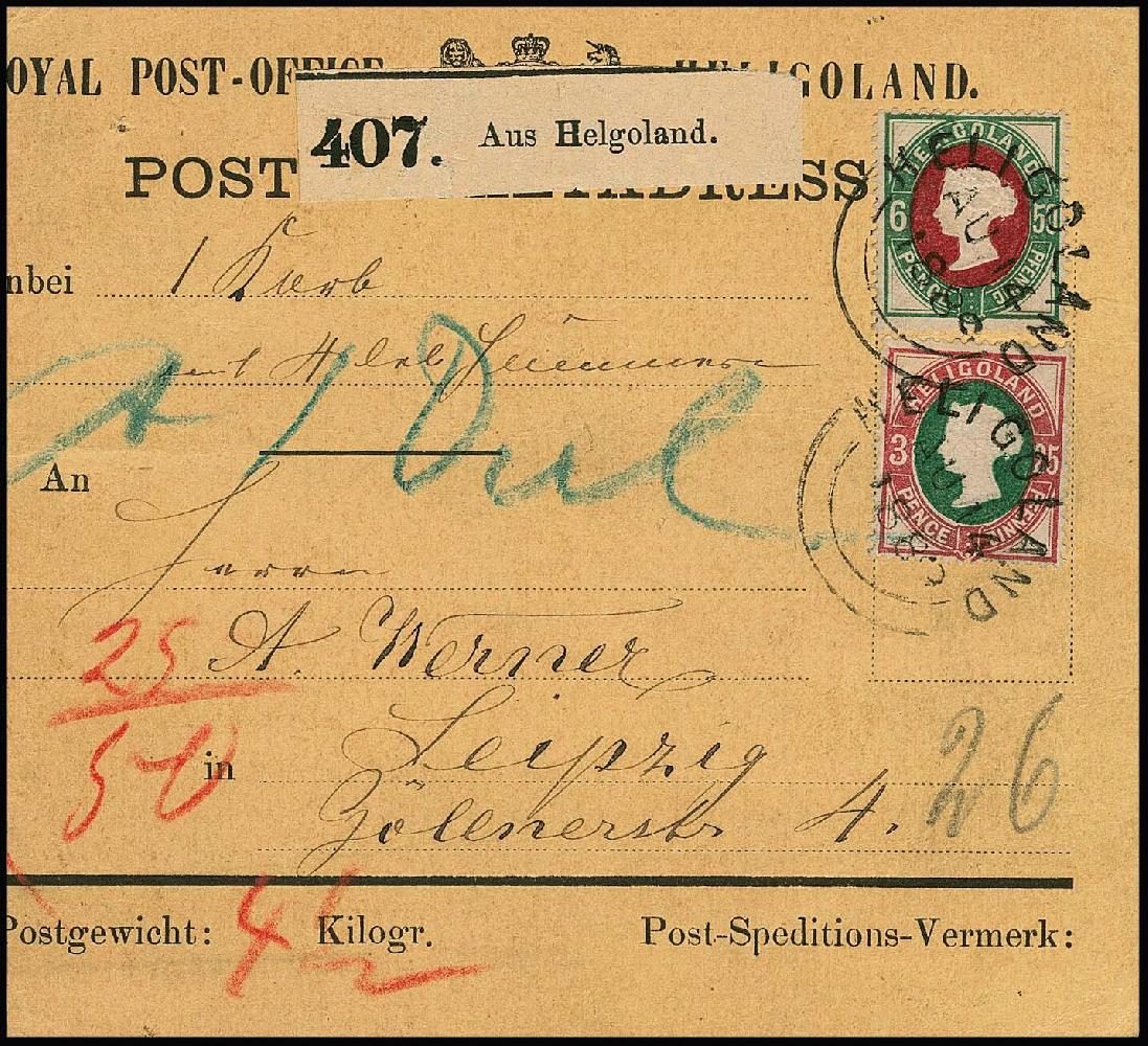 | Zusatzinformationen und Suchstichworte: | Rauhut & Kruschel - 219. Auktion 29. Juli 2023 Los 687 Altdeutschland Helgoland 25 Pfg. lilakarmin/grün (unten ein kurzer Zahn) und 50 Pfg. grün/dunkellilakarmin auf Paketkarte für "1 Korb mit 4 leb. Hummer" 1889 von Helgoland nach Leipzig. Paketkarten von Helgoland sind selten! Ausruf 1.600,00 EUR |