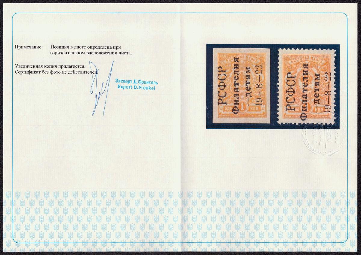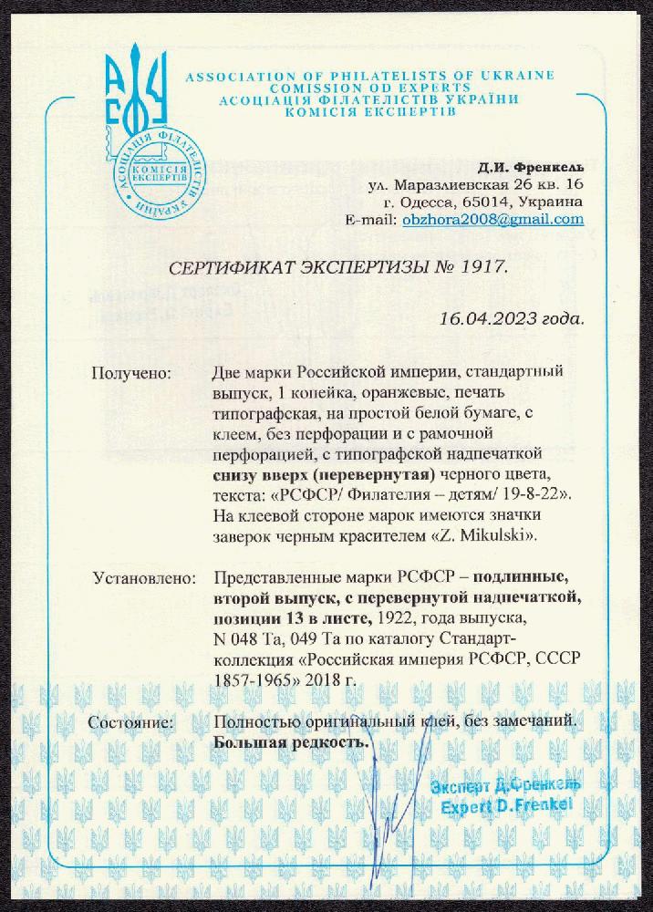 | Zusatzinformationen und Suchstichworte: | Oldlouis 30. Auktion - Russland, Territorien & Ukraine 4 - 7. Juli 2023 Los 764 Sowjetunion RSFSR 1918-23 1922 1k Philatelie zu Kinder, RSFSR, Russland (Zag. 048Ta, 049Ta, kopfstehende Aufdrucke, Attest, CV $4,800). Postfrisch/ungebraucht Ausruf 2.500,00 USD |