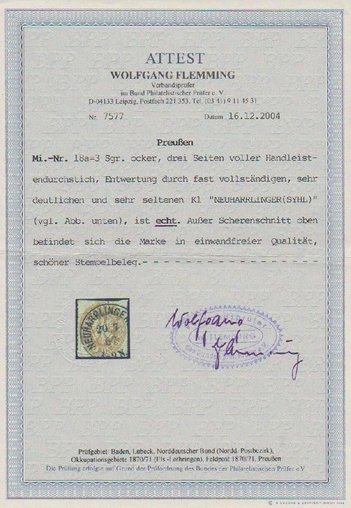 | Zusatzinformationen und Suchstichworte: | Rauhut & Kruschel - 219. Auktion 29. Juli 2023 Los 994 Altdeutschland Preussen "Neuharlingersyhl", Grotesk-K1 auf 1 Sgr. karmin und 3 Sgr. braun (je min. Schere), für 3 Sgr. Ausruf 100,00 EUR |