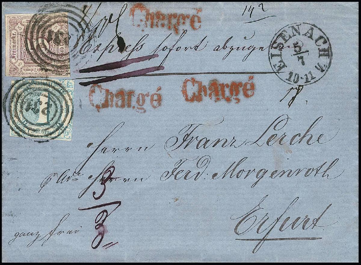| Zusatzinformationen und Suchstichworte: | Rauhut & Kruschel - 219. Auktion 29. Juli 2023 Los 1965 Altdeutschland Thurn und Taxis 1 Sgr. blau und 5 Sgr. purpur, diese meist breitrandig und nur links oben leicht berührt, auf vollfrankiertem Chargé-Expreßbrief von Eisenach 1862 nach Erfurt. Porto 1 Sgr. plus 2 Sgr. Reco und 3 Sgr. Expreß, als vollständig frankiertes Porto selten Ausruf 450,00 EUR |
