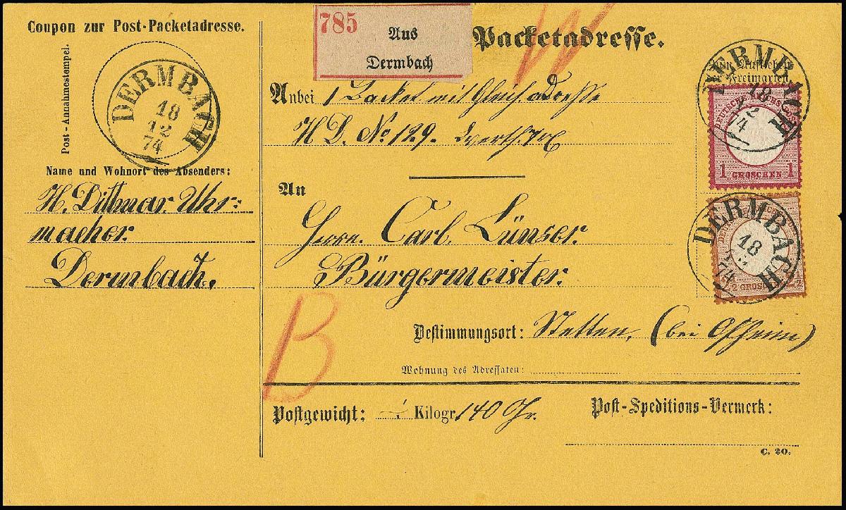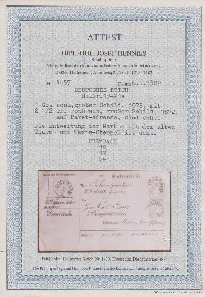 | Zusatzinformationen und Suchstichworte: | Rauhut & Kruschel - 219. Auktion 29. Juli 2023 Los 2378 Deutsches Reich, 1872 Grosser Brustschild 1 Gr. karmin und 2 1/2 Gr. rotbraun auf vollständiger Inlands-Wert-Paketkarte mit nachverwendetem Taxis-K1 "Dermbach" nach Stetten bei Ostheim, der Coupon noch anhängend. Handschriftlich "W" für den deklarierten Wert sowie "B" für Beutelstück. Die Marken vollzähnig, lediglich bei der 1 Gr. oben links zwei Zähne gering verkürzt, im Attest Hennies nicht bemängelt. Als vollständige Wert-Paketkarte in so dekorativer Erhaltung ein ungewöhnliches Poststück. Attest Hennies: "Die Marken sind einwandfrei, die Post-Paketadresse ist vorzüglich erhalten." Ausruf 1.300,00 EUR |