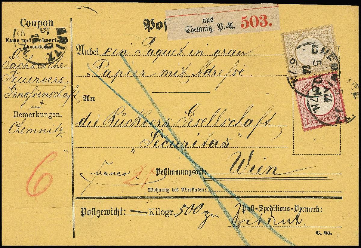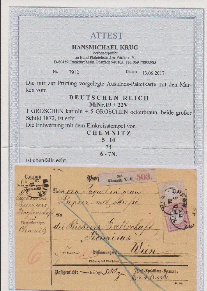 | Zusatzinformationen und Suchstichworte: | Rauhut & Kruschel - 219. Auktion 29. Juli 2023 Los 2409 Deutsches Reich, 1872 Grosser Brustschild 5 Gr. ockerbraun, perfektes Exemplar mit Plattenfehler "Farbstrich", nebst 1 Gr. karmin (zwei kurze Zähne), auf vollständiger gelber Paketkarte (üblich ausserhalb gefaltet) mit K1 "Chemnitz" 1874 nach Wien Ausruf 200,00 EUR |