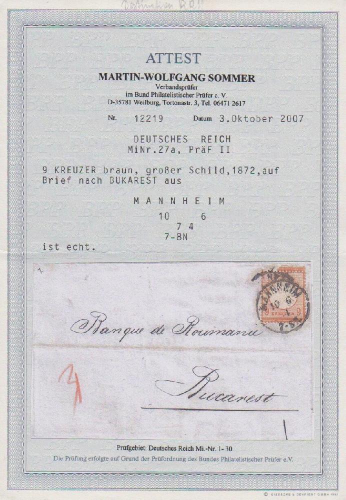 | Zusatzinformationen und Suchstichworte: | Rauhut & Kruschel - 219. Auktion 29. Juli 2023 Los 2425 Deutsches Reich, 1872 Grosser Brustschild 9 Kr. rotbraun, perfektes Exemplar (vom Unterrand) als seltene Einzelfrankatur auf Faltbrief von Mannheim 1874 an die Bank von Rumänien in Bukarest. Marke zudem mit Prägefehler II. Als Einzelfrankatur nach Rumänien sehr selten und ungewöhnlich, da der Absender offensichtlich nicht die Portotarife kannte Ausruf 1.000,00 EUR |