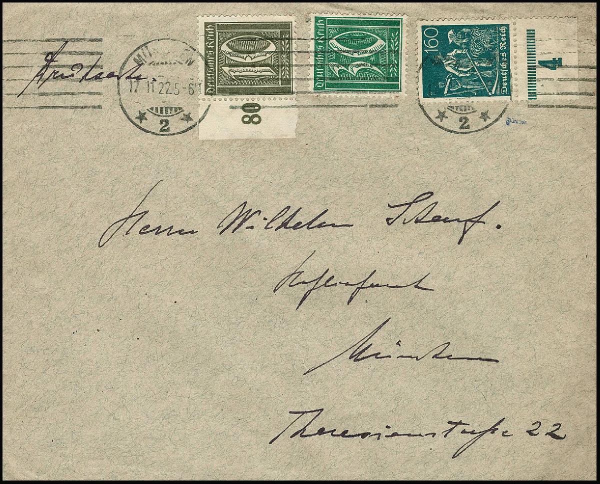| Zusatzinformationen und Suchstichworte: | Rauhut & Kruschel - 219. Auktion 29. Juli 2023 Los 2579 Deutsches Reich, 1918/23 Inflationsausgaben 30, 10 und 160 Pfg., je gutes Wasserzeichen "Waffeln", auf portogerechtem Bedarfs-Ortsbrief aus München Ausruf 400,00 EUR |