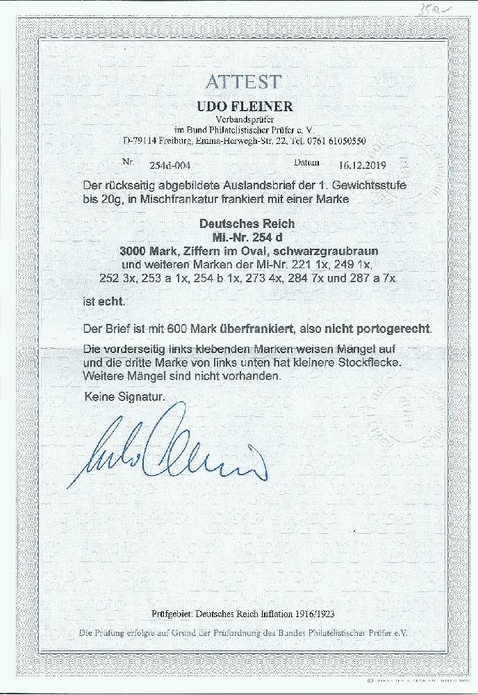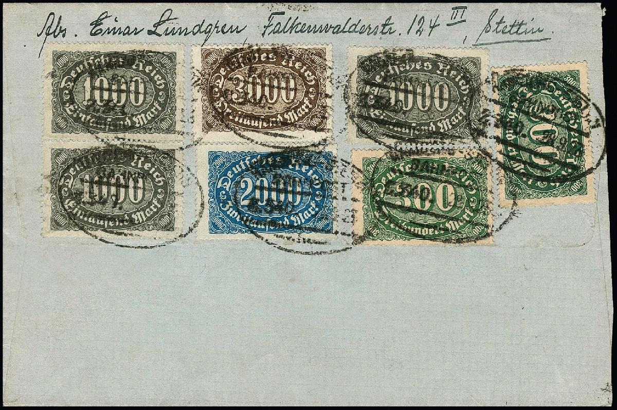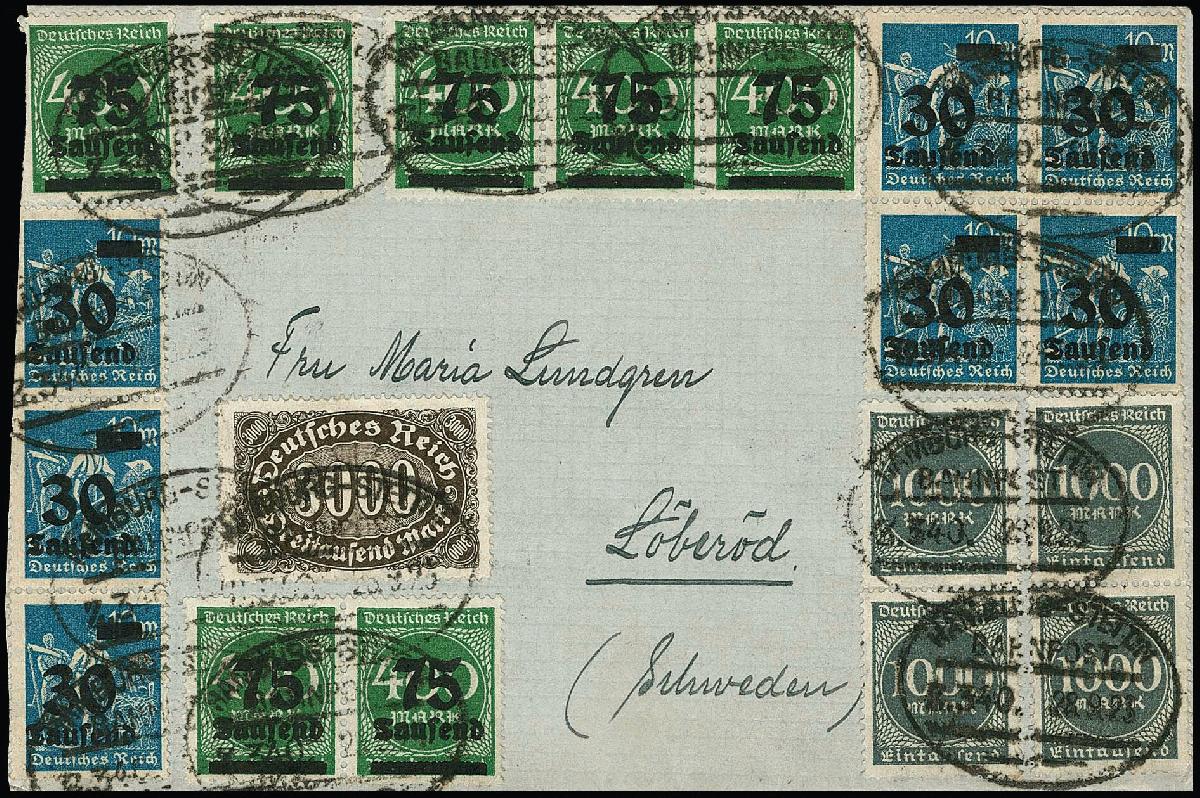 | Zusatzinformationen und Suchstichworte: | Rauhut & Kruschel - 219. Auktion 29. Juli 2023 Los 2615 Deutsches Reich, 1918/23 Inflationsausgaben 3000 Mk., tadelloses Exemplar in der seltenen schwarzgraubraunen Nuance, nebst zahlreichen weiteren Marken, Nr. 221, 249, 252(3), 253a, 254b, 273(4), 284(7) und 287a(7), auf ganz gering überfrankiertem Auslandsbrief (Soll 750.000,-, Ist 750.600,-) mit Bahnpoststempel "Hamburg-Stettin" 1923 nach Schweden. Auf Brief (Mi. 600,-) seltene Nuance Ausruf 100,00 EUR |