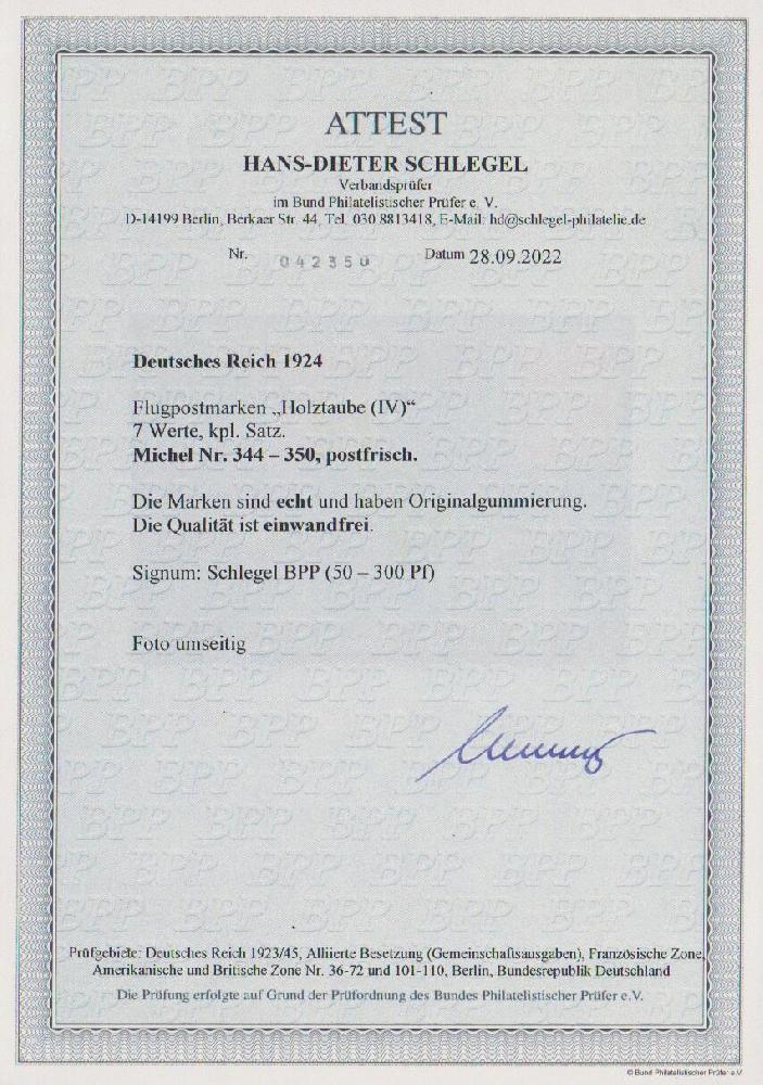 | Zusatzinformationen und Suchstichworte: | Rauhut & Kruschel - 219. Auktion 29. Juli 2023 Los 2658 Deutsches Reich, 1923/32 Weimarer Republik Flugpost postfrisch, ab 50 Pfg. sign. Schlegel, sowie für kpl. Serie neues Attest H.D. Schlegel. Mi. 1500,- Ausruf 320,00 EUR |