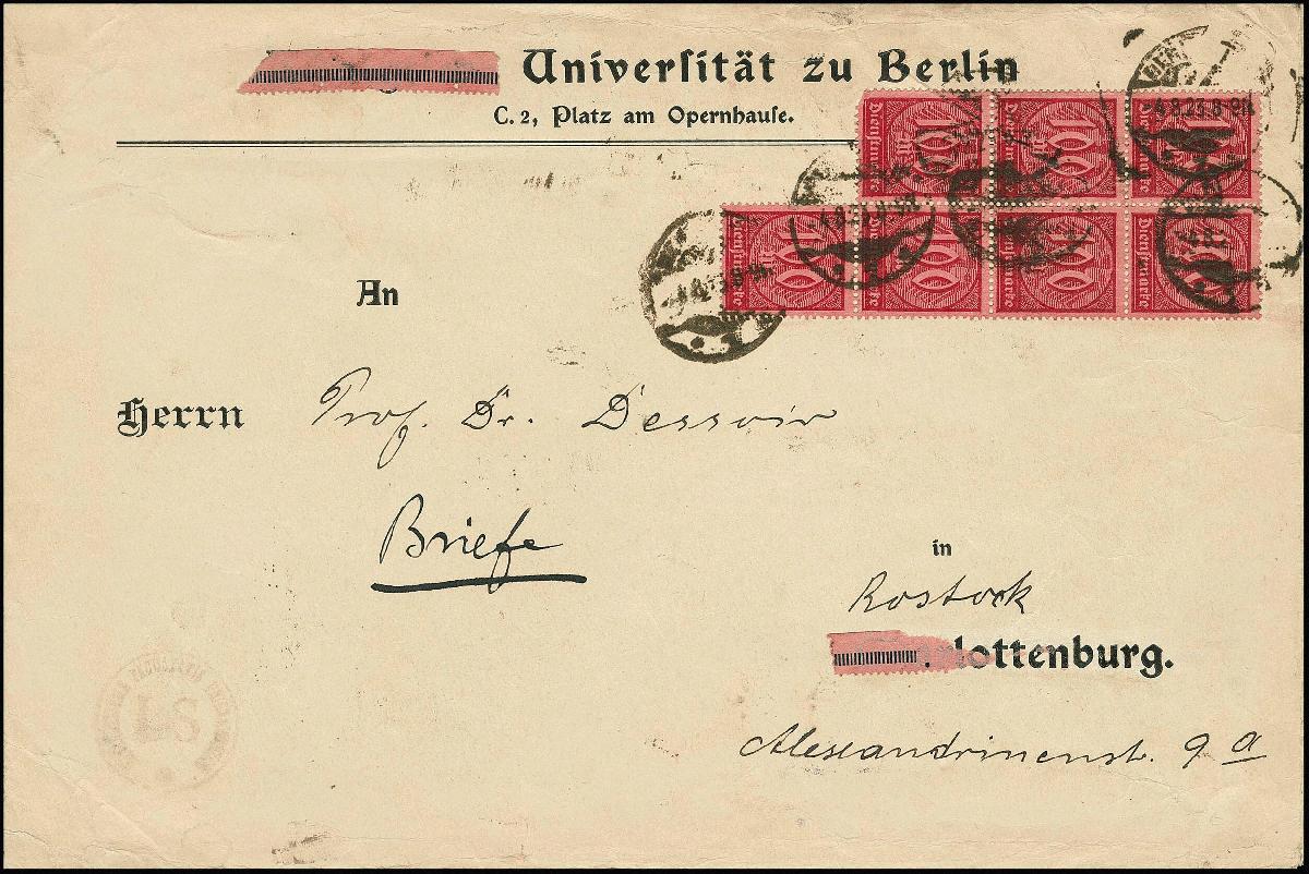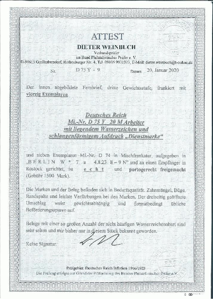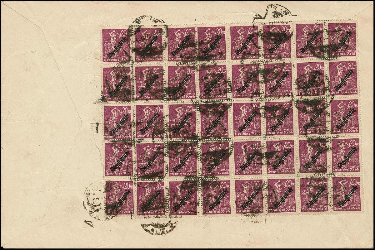 | Zusatzinformationen und Suchstichworte: | Rauhut & Kruschel - 219. Auktion 29. Juli 2023 Los 3099 Deutsches Reich 20 Mk. Arbeiter mit liegendem Wasserzeichen, 40 Exemplare in meist großen Einheiten rückseitig, vorderseitig Siebenerblock 100 Mk., als portogerechte Frankatur auf zur Präsentation dreiseitig geöffnetem Brief von Berlin, 4.8.1923, nach Rostock. Für eine solche Frankatur gute Bedarfserhaltung (wenige Werte kleine Zahnfehler etc.), es handelt sich um eine bedeutende Seltenheit der Infla-Dienstmarken, keine weitere Frankatur mit so vielen Exemplaren der Nr. 75Y registriert! Attest Weinbuch. Mi. 7760,- + Ausruf 2.200,00 EUR |