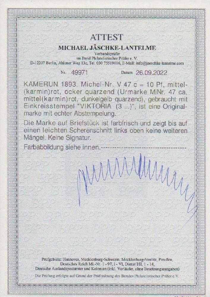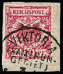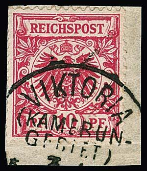 | Zusatzinformationen und Suchstichworte: | Rauhut & Kruschel - 219. Auktion 29. Juli 2023 Los 3291 Deutsche Kolonien Kamerun, Vorläufer Vorläufer Krone-Adler 10 Pfg. in guter Farbe mittelrot auf kleinem Briefstück (links oben min. verkürzte Zähne) mit seltener Abstempelung durch K1 "Victoria" Ausruf 200,00 EUR |