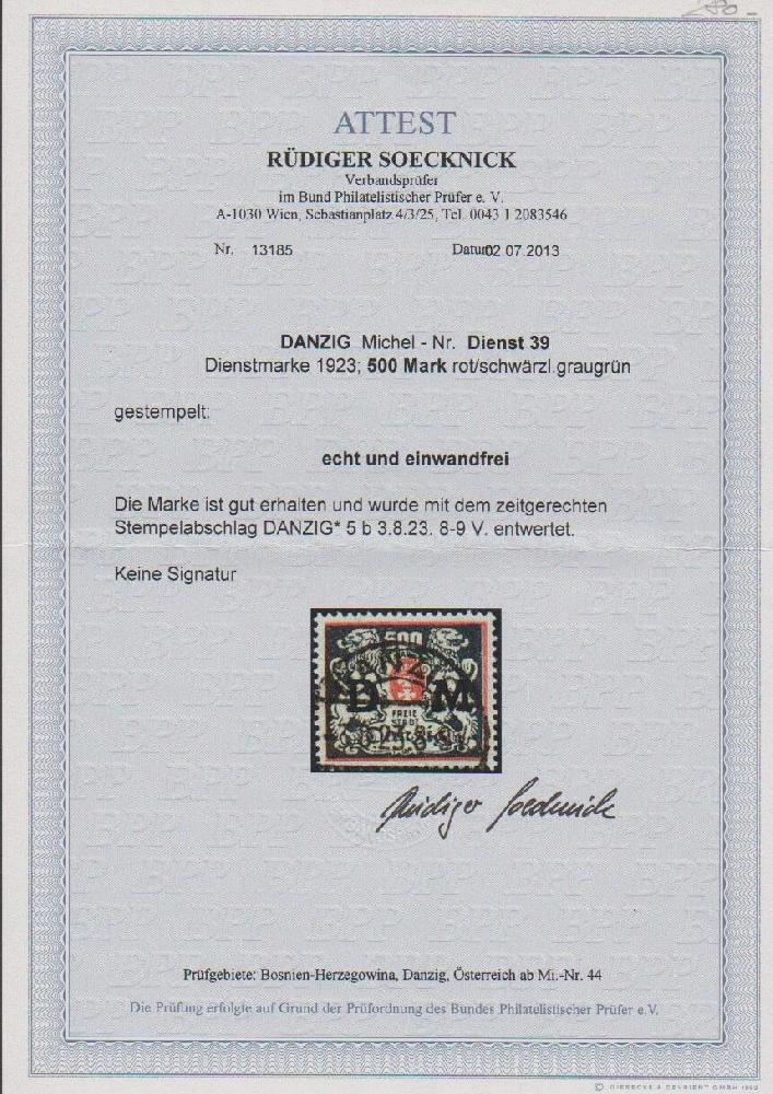 | Zusatzinformationen und Suchstichworte: | Rauhut & Kruschel - 219. Auktion 29. Juli 2023 Los 3391 Danzig Dienst 500 Mk. tadellos gestempelt "Danzig" Ausruf 140,00 EUR |