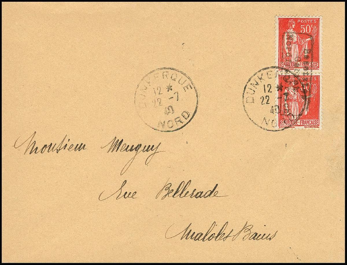 | Zusatzinformationen und Suchstichworte: | Rauhut & Kruschel - 219. Auktion 29. Juli 2023 Los 3501 Deutsche Besetzung II. WK Frankreich Dünkirchen Dünkirchen, 50 C. im senkrechten Paar mit kopfstehendem senkrechten Aufdruck in Type I auf portoger. Brief aus Dünkirchen Ausruf 150,00 EUR |