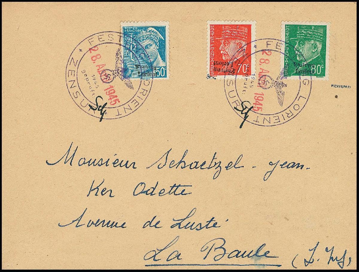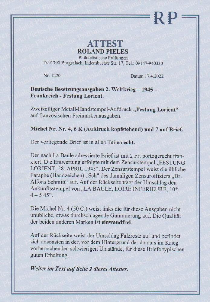 | Zusatzinformationen und Suchstichworte: | Rauhut & Kruschel - 219. Auktion 29. Juli 2023 Los 3513 Deutsche Besetzung II. WK Frankreich Dünkirchen Festung Lorient, 50 C. Merkur (typisch leicht durchschlagende Gummierung), 70 C. Petain mit kopfstehendem Aufdruck, und 80 C. Petain auf Brief mit Zensurstempel "Festung Lorient" vom 28.4.1945 und handschriftlicher Paraphe "Sch" des Zensuroffiziers Schmitt, nach La Baule mit Ankunftsstempel (beide Gebiete waren eingekesselt, dadurch Beförderung nur auf dem Seeweg möglich). Briefe dieses Gebietes sind durchweg selten, wie auch das Attest Pieles bestätig Ausruf 1.800,00 EUR |