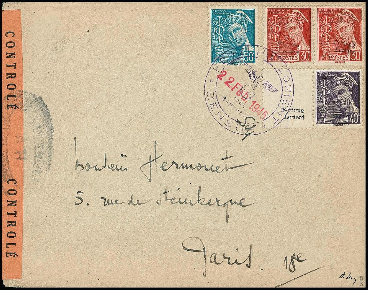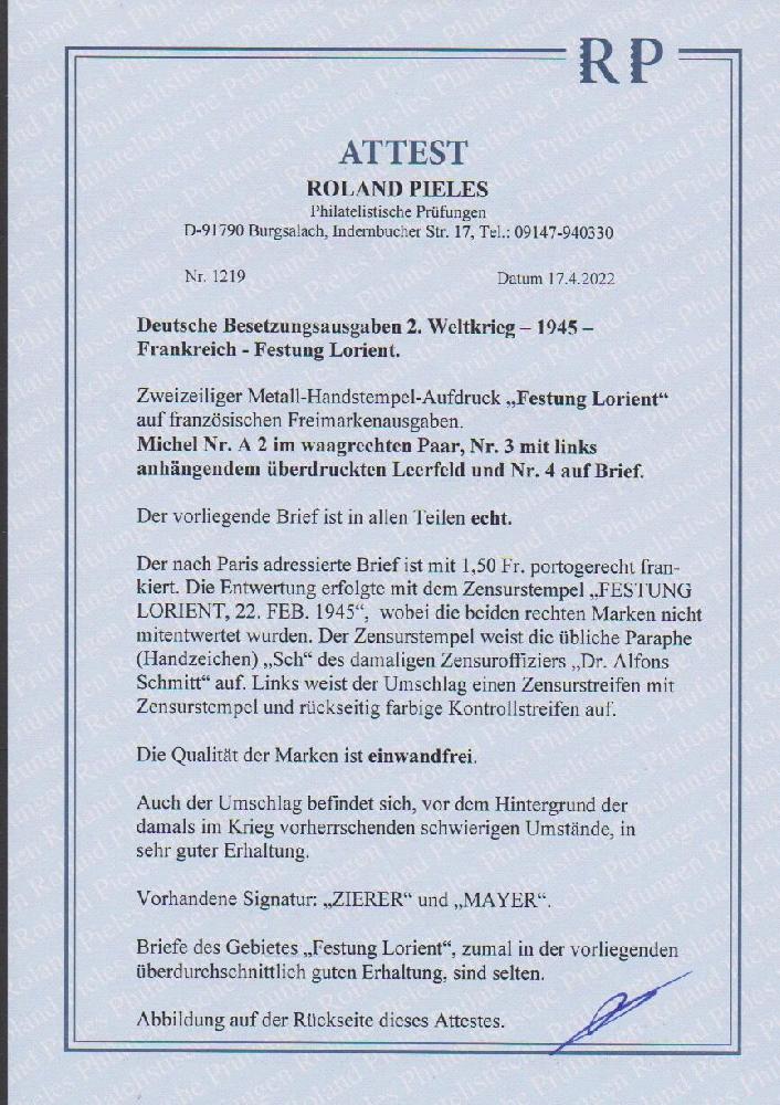 | Zusatzinformationen und Suchstichworte: | Rauhut & Kruschel - 219. Auktion 29. Juli 2023 Los 3514 Deutsche Besetzung II. WK Frankreich Lorient Festung Lorient, 30 C. Merkurkopf, im Paar, nebst 40 C. Merkurkopf mit Leerfeld links und 50 C., auf Brief mit Zensurstempel "Festung Lorient", 22. Februar 1945, sowie handschriftlicher Paraphe "Sch" des Zensuroffiziers Schmitt, nach Paris mit links weiterem Zensurstreifen. Attest Pieles "... einwandfrei ... Briefe des Gebietes "Festung Lorient", zumal in der vorliegenden überdurchschnittlich guten Erhaltung, sind selten". Ausruf 2.200,00 EUR |