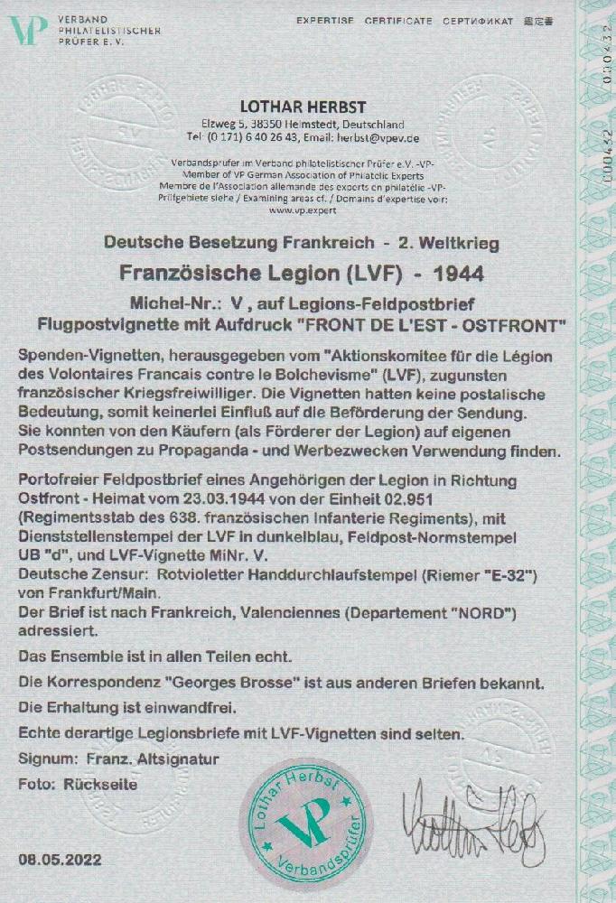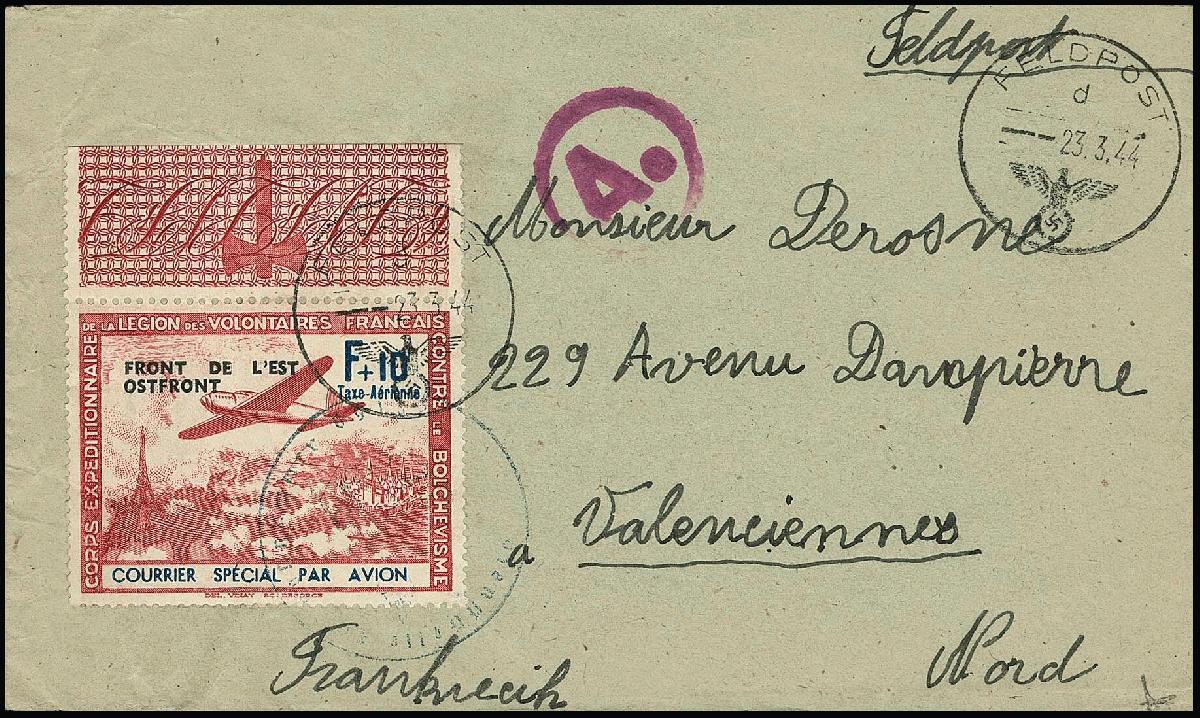 | Zusatzinformationen und Suchstichworte: | Rauhut & Kruschel - 219. Auktion 29. Juli 2023 Los 3530 Deutsche Besetzung II. WK Französische Legion Legions-Ausgaben, Flugpost-Vignette + 10 Fr. bräunlichrot/dunkelkobalt vom Oberrand auf echt gelaufenem Zensur-Bedarfsbrief (mit Inhalt!) mit Feldpoststempel vom 23.3.44, Michel echt gestempelt nicht bewertet, Attest Herbst: "Echte derartige Legionsbriefe ... sind selten." Ausruf 250,00 EUR |
