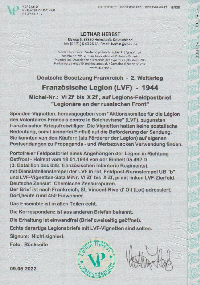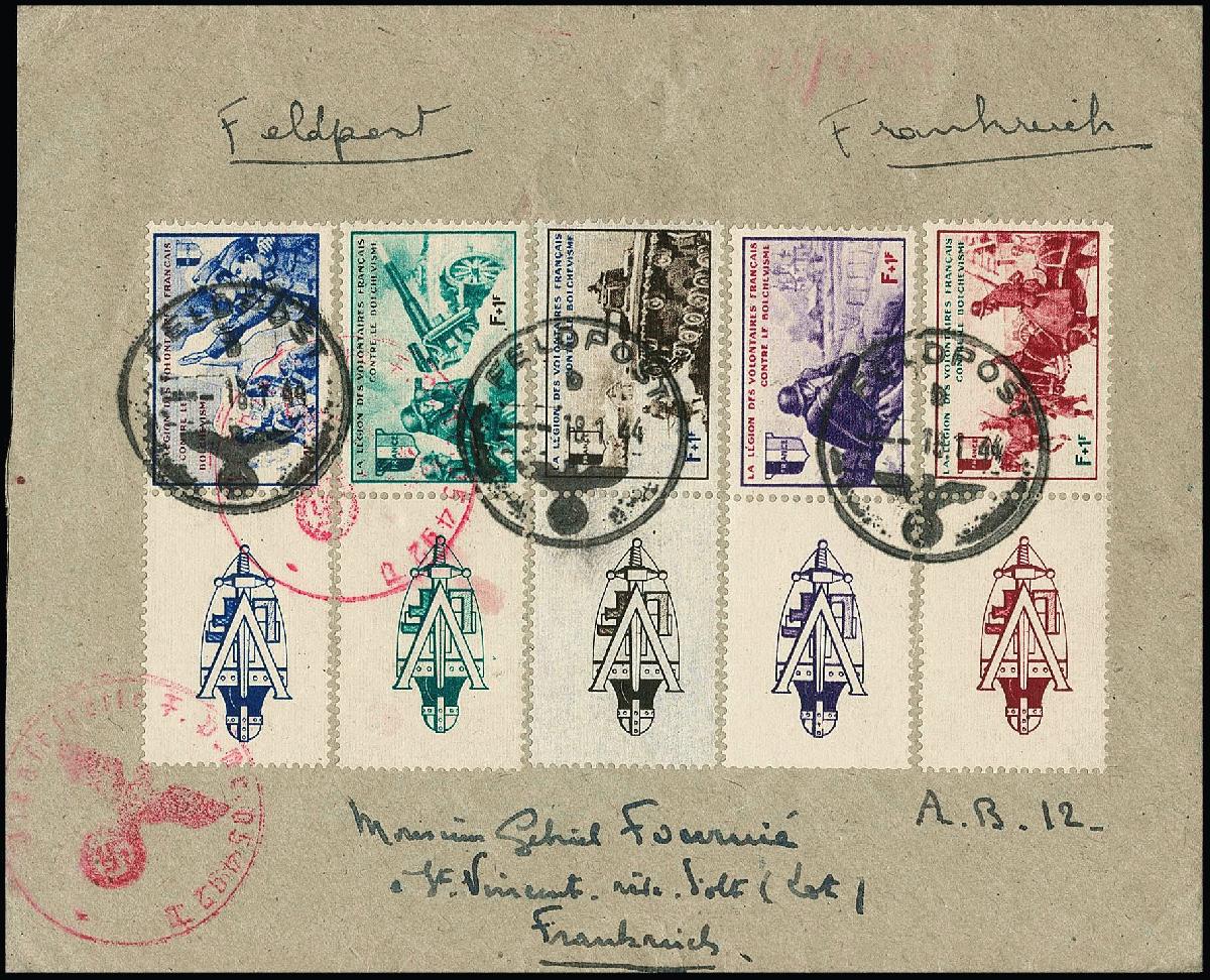 | Zusatzinformationen und Suchstichworte: | Rauhut & Kruschel - 219. Auktion 29. Juli 2023 Los 3532 Deutsche Besetzung II. WK Französische Legion Legions-Ausgaben, Legionäre an der russischen Front, komplette Zierfeld-Serie (!) auf echt gelaufenem Zensur-Brief mit Feldpoststempel vom 18.1.44, Brief zweiseitig geöffnet, Michel echt gestempelt nicht bewertet, Attest Herbst: "Echte derartige Legionsbriefe ... sind selten." Ausruf 500,00 EUR |