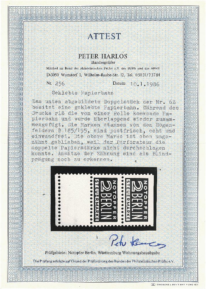 | Zusatzinformationen und Suchstichworte: | Notopfer Nr. 6 Z geklebte Papierbahn |