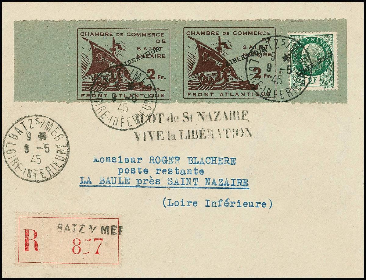 | Zusatzinformationen und Suchstichworte: | Rauhut & Kruschel - 219. Auktion 29. Juli 2023 Los 3547 Deutsche Besetzung II. WK Frankreich St.Nazaire St. Nazaire, 2 Fr. Handelskammer im Paar, dabei rechte Marke mit Plattenfehler "ohne Stecherzeichen", nebst 2 Fr. Freimarke, alle mit Handstempel "Liberation", auf tadellosem R-Brief vom 9.5.1945. Mi. 2960,- Ausruf 750,00 EUR |