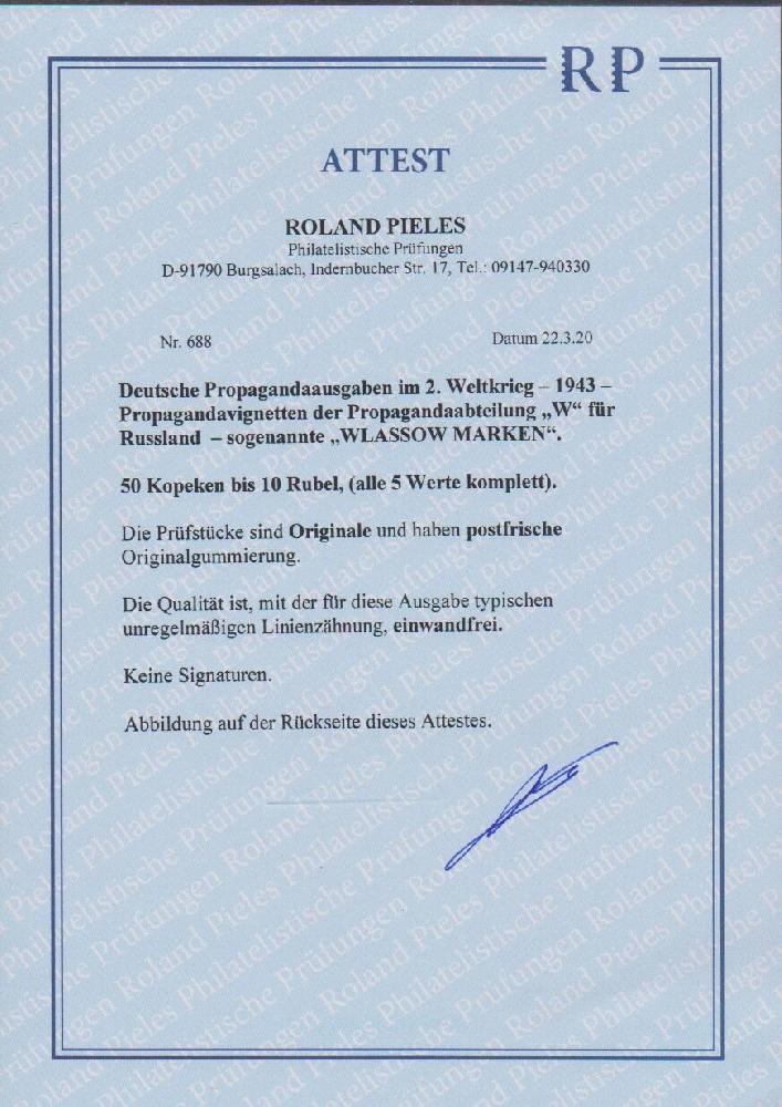 | Zusatzinformationen und Suchstichworte: | Rauhut & Kruschel - 219. Auktion 29. Juli 2023 Los 3571 Deutsche Besetzung II. WK Russland - Pleskau 1943, Deutsche Propaganda-Vignetten der Propaganda-Abteilung "W" für Russland, kpl. Serie der sog. "Wlassow-Marken" von 50 Kop. bis 10 Rubel postfrisch, seltene Ausgabe Ausruf 400,00 EUR |