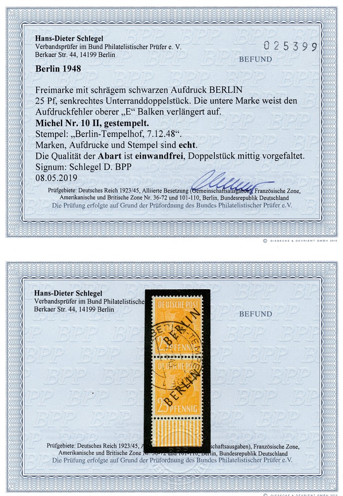 | Zusatzinformationen und Suchstichworte: | Berlin MiNr. 10 II im senkrechten Paar mit Unterrand |