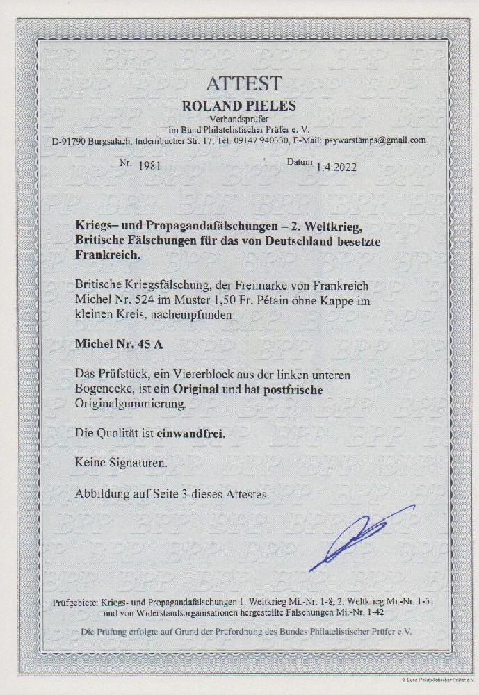 | Zusatzinformationen und Suchstichworte: | Rauhut & Kruschel - 219. Auktion 29. Juli 2023 Los 3617 Kriegs und Propagandafälschungen II. WK Britische Fälschungen für das von Deutschland besetzte Frankreich, 1,50 Fr. Petain im postfrischen Viererblock aus der linken unteren Bogenecke Ausruf 180,00 EUR |