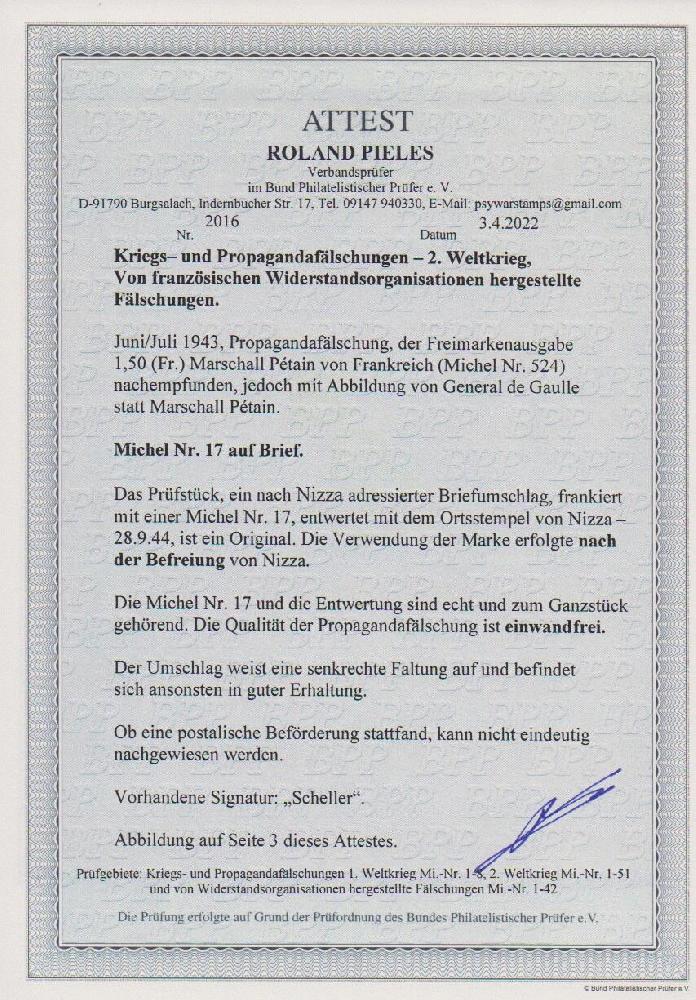 | Zusatzinformationen und Suchstichworte: | Rauhut & Kruschel - 219. Auktion 29. Juli 2023 Los 3632 Kriegs und Propagandafälschungen II. WK Fälschungen französischer Widerstands-Organisationen, 1,50 Fr. Petain auf Couvert (senkrechte Faltspur ausserhalb) mit Stempel von Nizza, 28.9.44. Schon lose gestempelt äusserst selten und im Michel nur mit "-.-" notiert Ausruf 500,00 EUR |