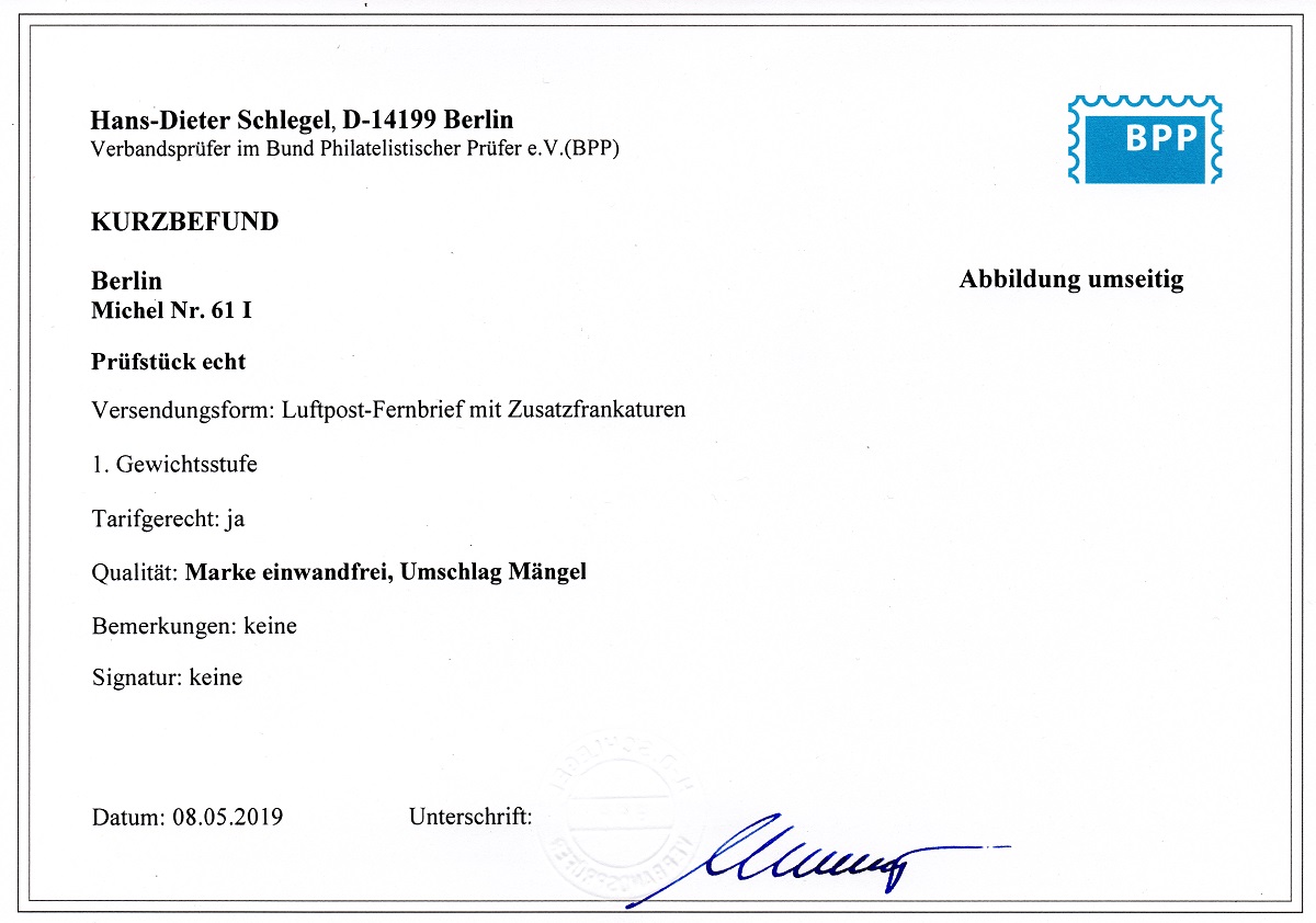 | Zusatzinformationen und Suchstichworte: | Berlin MiNr. 61 I mit Zusatzfrankatur auf Brief |