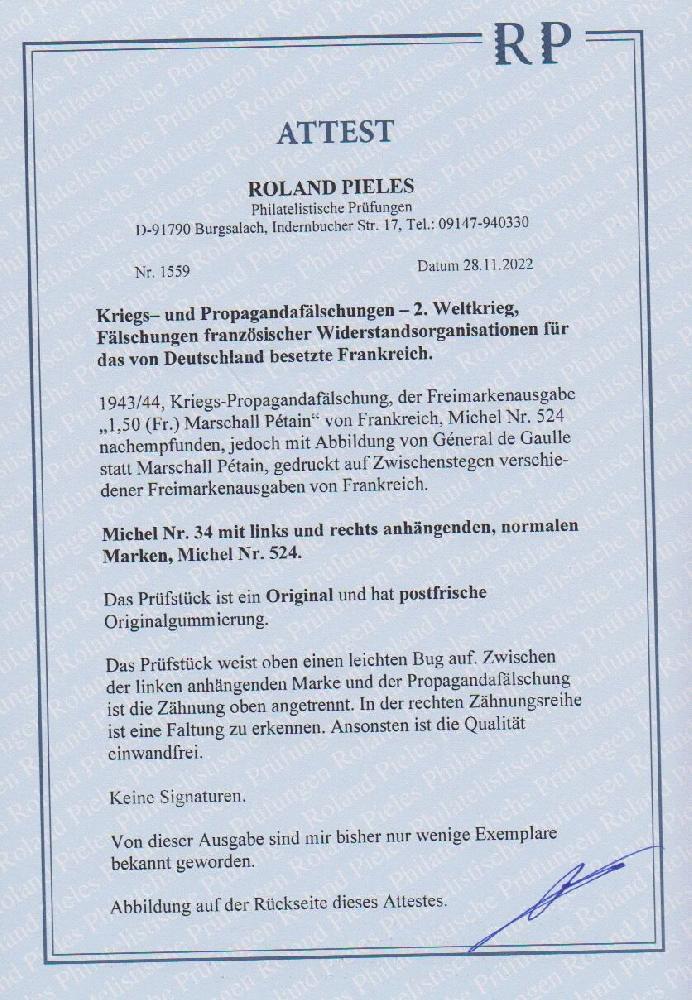 | Zusatzinformationen und Suchstichworte: | Rauhut & Kruschel - 219. Auktion 29. Juli 2023 Los 3636 Kriegs und Propagandafälschungen II. WK Fälschungen französischer Widerstandsorganisationen für das von Deutschland besetzte Frankreich, 1,50 Fr. Petain, gedruckt auf Zwischenstegpaar 1,50 Fr., postfrisch, leichte Vorfaltung in der Zähnung bzw. Bugspur. Mi. 1900,-, Attest Pieles "nur wenige Exemplare bekannt" Ausruf 800,00 EUR |