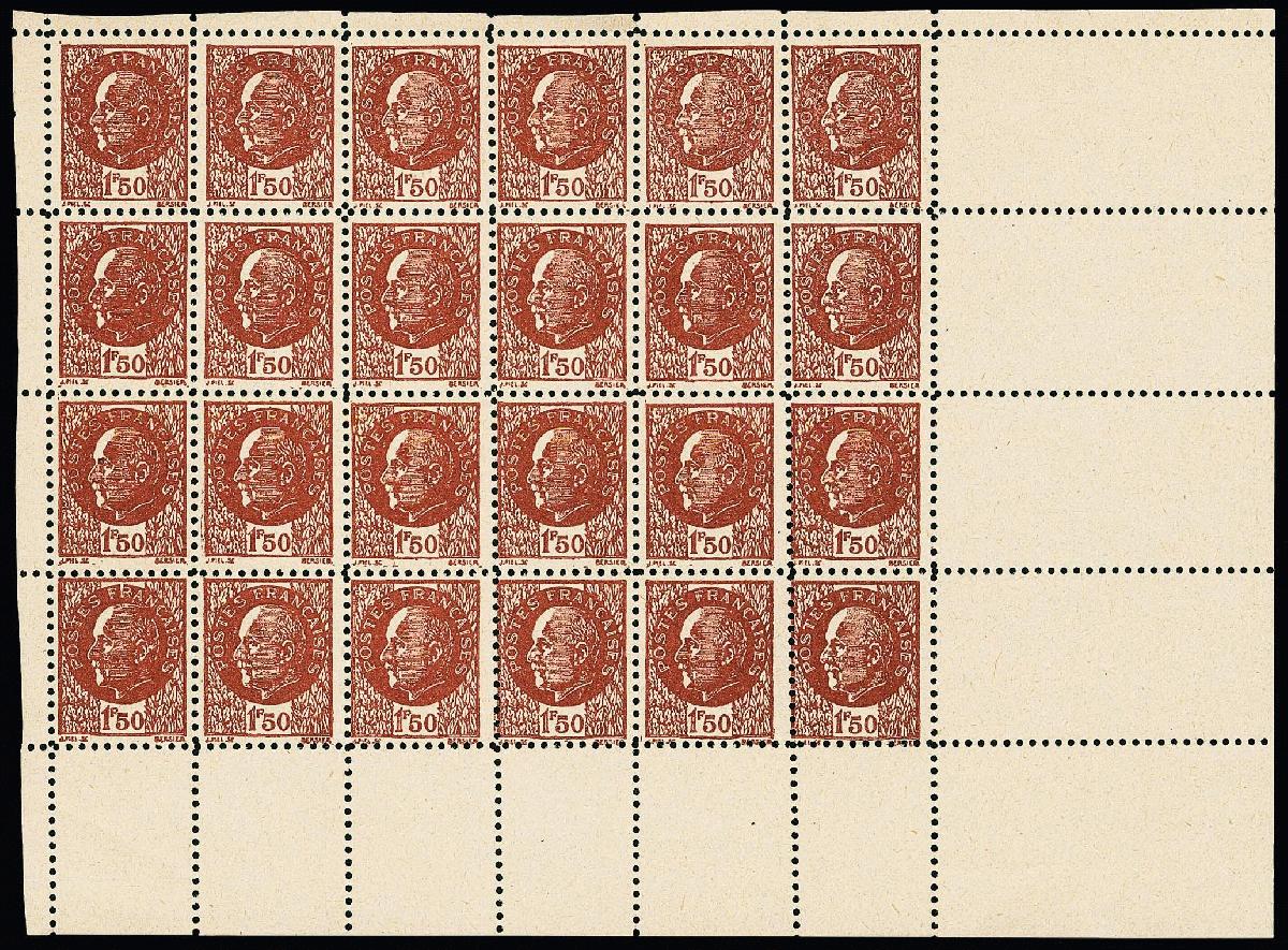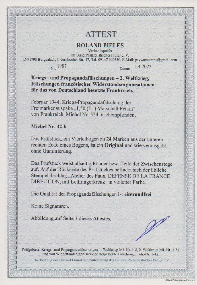 | Zusatzinformationen und Suchstichworte: | Rauhut & Kruschel - 219. Auktion 29. Juli 2023 Los 3649 Kriegs und Propagandafälschungen II. WK Fälschungen französischer Widerstands-Organisationen, 1,50 Fr. Petain, braunrot, im vollständigen Viertelbogen zu 24 Ex., ungebraucht wie verausgabt Ausruf 150,00 EUR |