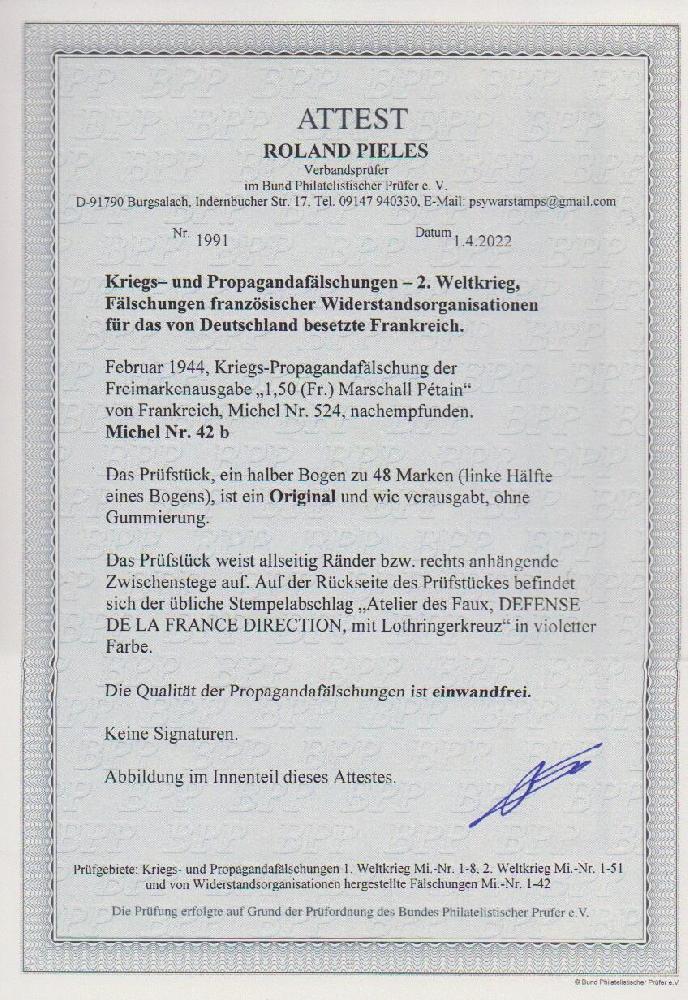 | Zusatzinformationen und Suchstichworte: | Rauhut & Kruschel - 219. Auktion 29. Juli 2023 Los 3654 Kriegs und Propagandafälschungen II. WK Fälschungen französischer Widerstands-Organisationen, 1,50 Fr. Petain, braunrot, im halben ungebrauchten Bogen zu 48 Exemplaren, wie verausgabt, mit sechs Zwischenstegpaaren Ausruf 280,00 EUR |