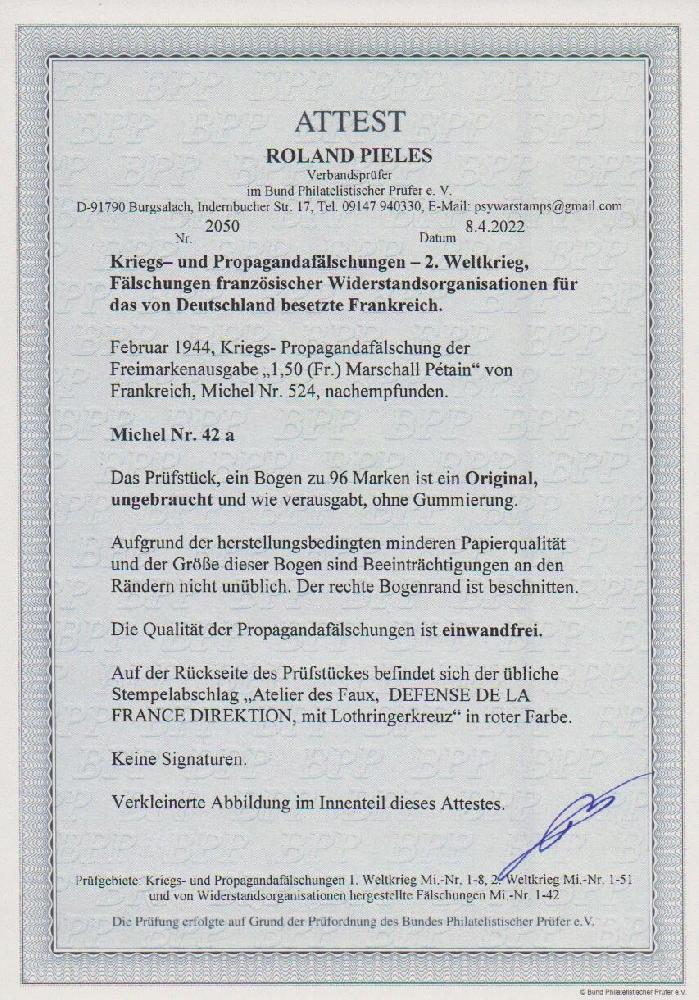 | Zusatzinformationen und Suchstichworte: | Rauhut & Kruschel - 219. Auktion 29. Juli 2023 Los 3655 Kriegs und Propagandafälschungen II. WK Fälschungen französischer Widerstands-Organisationen, 1,50 Fr. Petain, braunrot, im vollständigen Originalbogen, wie verausgabt ungebraucht, mit allen Zwischenstegpaaren und Herzstück Ausruf 600,00 EUR |