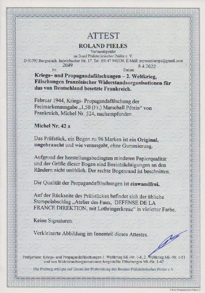 | Zusatzinformationen und Suchstichworte: | Rauhut & Kruschel - 219. Auktion 29. Juli 2023 Los 3656 Kriegs und Propagandafälschungen II. WK Fälschungen französischer Widerstands-Organisationen, 1,50 Fr. Petain, braunrot, im vollständigen Originalbogen, wie verausgabt ungebraucht, mit allen Zwischenstegpaaren und Herzstück Ausruf 600,00 EUR |