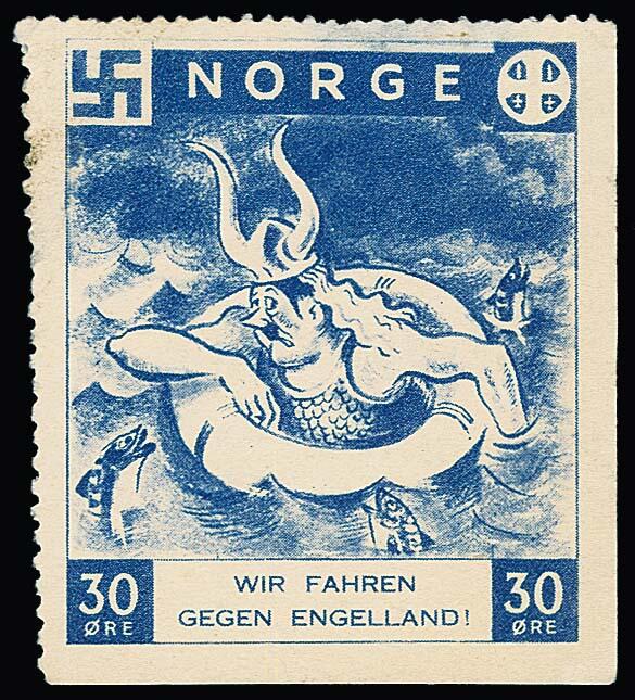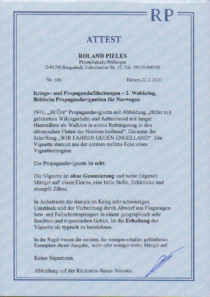 | Zusatzinformationen und Suchstichworte: | Rauhut & Kruschel - 219. Auktion 29. Juli 2023 Los 3662 Kriegs und Propagandafälschungen II. WK Britische Propaganda-Vignetten für Norwegen, 30 Ö. blau, Abb. "Hitler mit gehörntem Wikingerhelm in einem Rettungsring", ungebraucht in typischer Erhaltung (zwei kleine Schürfstellen). Attest Pieles: "In der Regel weisen die meisten der wenigen erhalten gebliebenen Exemplare dieser Ausgabe mehr oder weniger starke Mängel auf." Ausruf 400,00 EUR |