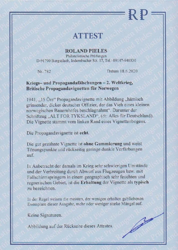 | Zusatzinformationen und Suchstichworte: | Rauhut & Kruschel - 219. Auktion 29. Juli 2023 Los 3665 Kriegs und Propagandafälschungen II. WK Britische Propaganda-Vignetten für Norwegen, 15 Ö. grün, Abb. "hämisch grinsender, dicker deutscher Offizier, der das Vieh eines kleinen norwegischen Bauernhofs beschlagnahmt", ungebraucht in abwurf-bedingter typischer Erhaltung. Attest Pieles: "In der Regel weisen die meisten der wenigen erhalten gebliebenen Exemplare dieser Ausgabe mehr oder weniger starke Mängel auf." Ausruf 300,00 EUR |