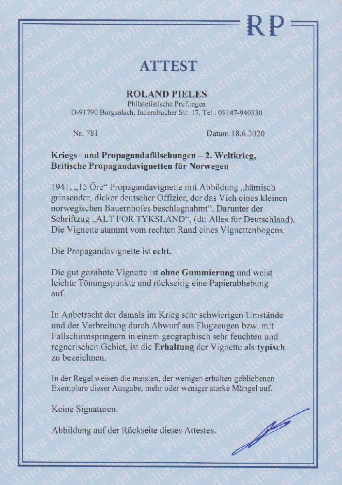 | Zusatzinformationen und Suchstichworte: | Rauhut & Kruschel - 219. Auktion 29. Juli 2023 Los 3670 Kriegs und Propagandafälschungen II. WK Britische Propaganda-Vignetten für Norwegen, 15 Ö. grün, Abb. "hämisch grinsender, dicker deutscher Offizier, der das Vieh eines kleinen norwegischen Bauernhofs beschlagnahmt", ungebraucht in abwurf-bedingter typischer Erhaltung. Attest Pieles: "In der Regel weisen die meisten der wenigen erhalten gebliebenen Exemplare dieser Ausgabe mehr oder weniger starke Mängel auf." Ausruf 300,00 EUR |