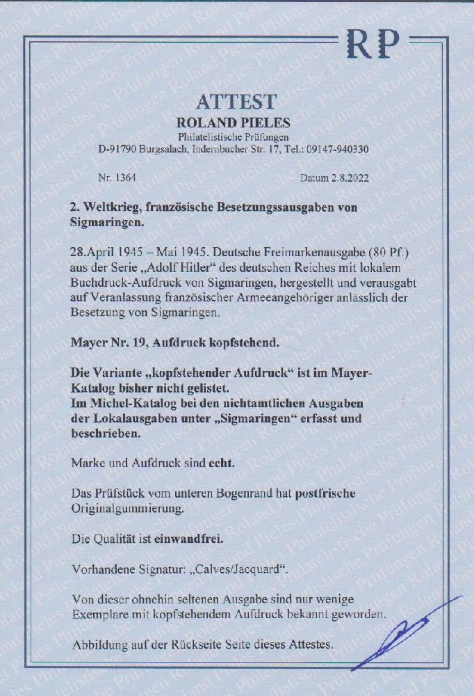 | Prüfgebiet: | Deutsche Lokalausgaben 1945 Sigmaringen |