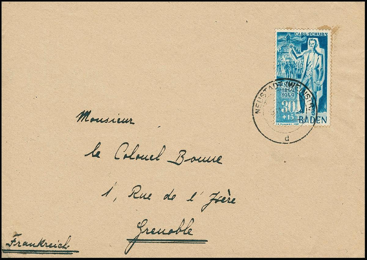 | Zusatzinformationen und Suchstichworte: | Rauhut & Kruschel - 219. Auktion 29. Juli 2023 Los 3842 Französische Zone Baden Schurz, jeder Wert als portoger. Einzelfrankatur: 10 Pfg. auf Postkarte, 20 Pfg. in guter Type II auf Brief, sowie 30 Pfg. (mit Fremdleim aufgeklebt) einzeln auf seltenem Auslandsbrief von Neustadt/Wstr. nach Frankreich Ausruf 250,00 EUR |