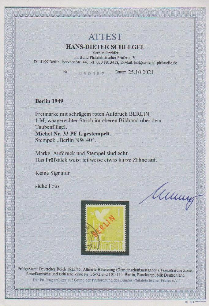| Zusatzinformationen und Suchstichworte: | Rauhut & Kruschel - 219. Auktion 29. Juli 2023 Los 3949 Berlin 1 DM Rotaufdruck gestempelt mit Plattenfehler der Urmarke "waagerechter Strich im oberen Bildrand" (Feld 1 einer Teilauflage). Allseits vollzähnig, einige Zahnspitzen wie üblich etwas verkürzt. Nur wenige gestempelte Exemplare bekannt, hier der Plattenfehler schön sichtbar. Mi. "-.-" Ausruf 450,00 EUR |