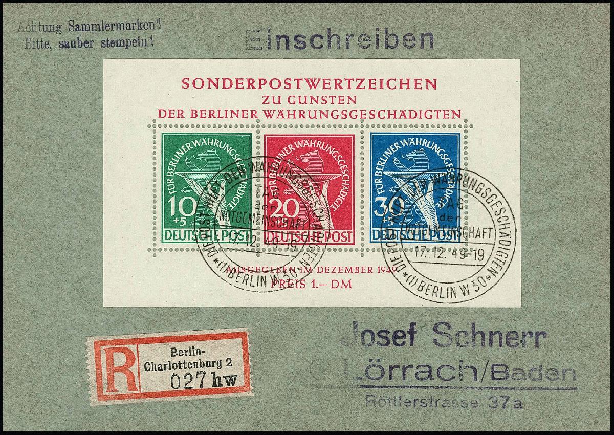 | Zusatzinformationen und Suchstichworte: | Rauhut & Kruschel - 219. Auktion 29. Juli 2023 Los 4089 Berlin Währungsgeschädigten-Block mit beiden Plattenfehlern, 10 Pfg. "gebrochenes C", 30 Pfg. "zusätzlicher Schraffierungsstrich", auf tadellosem portogerechtem Brief (mit Ersttagsstempel entwertet, aber erst später befördert). Dieser Block ist schon lose gestempelt mit 3500,- Michel notiert (FDC für normalen Block 4500,-), auf portogerechtem Brief ist dieser Block noch nicht einmal mit "-.-" bewertet, sondern mangels geringen Vorkommens überhaupt nicht gelistet! Ausruf 1.300,00 EUR |