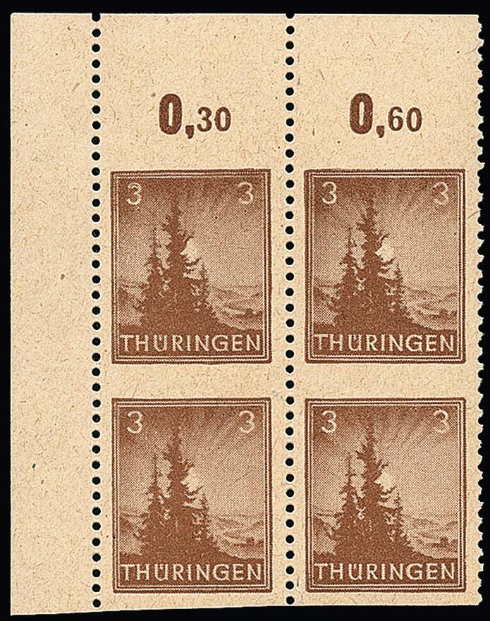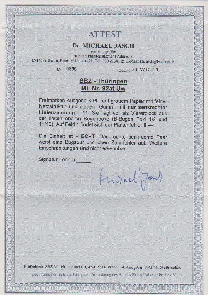 | Zusatzinformationen und Suchstichworte: | Rauhut & Kruschel - 219. Auktion 29. Juli 2023 Los 4282 Sowjetische Zone 3 Pfg. auf grauem Papier im postfrischen Viererblock aus der linken oberen Bogenecke (auf Feld 1 PF II) mit Abart "nur senkrecht gezähnt", rechtes Paar leichte Bugspur und oben rechts zwei kurze Zähne, Attest Jasch. Mi. 1400,- + Ausruf 250,00 EUR |