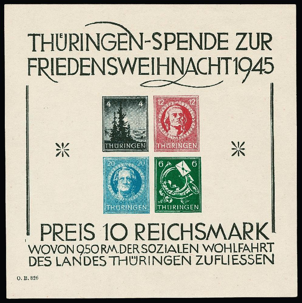 | Zusatzinformationen und Suchstichworte: | Rauhut & Kruschel - 219. Auktion 29. Juli 2023 Los 4303 Sowjetische Zone Weihnachtsblock als Sonderdruck ohne die vorgedruckte Durchstichleiste und ohne Durchstich postfrisch. Auflage nur 800 Exemplare. Gering bügig und winzige gelbe Pünktchen Ausruf 1.000,00 EUR |