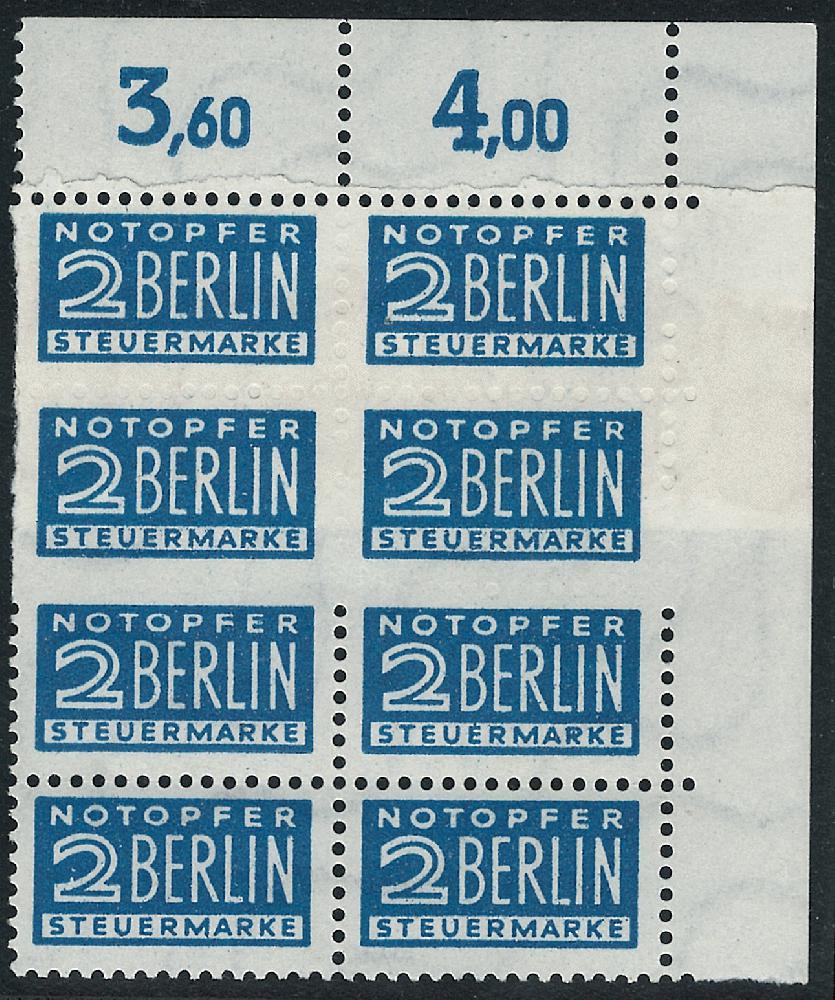 | Zusatzinformationen und Suchstichworte: | Notopfer Nr. 6 Z (früher 3 Z) 8er-Block mit geklebter Papierbahn |