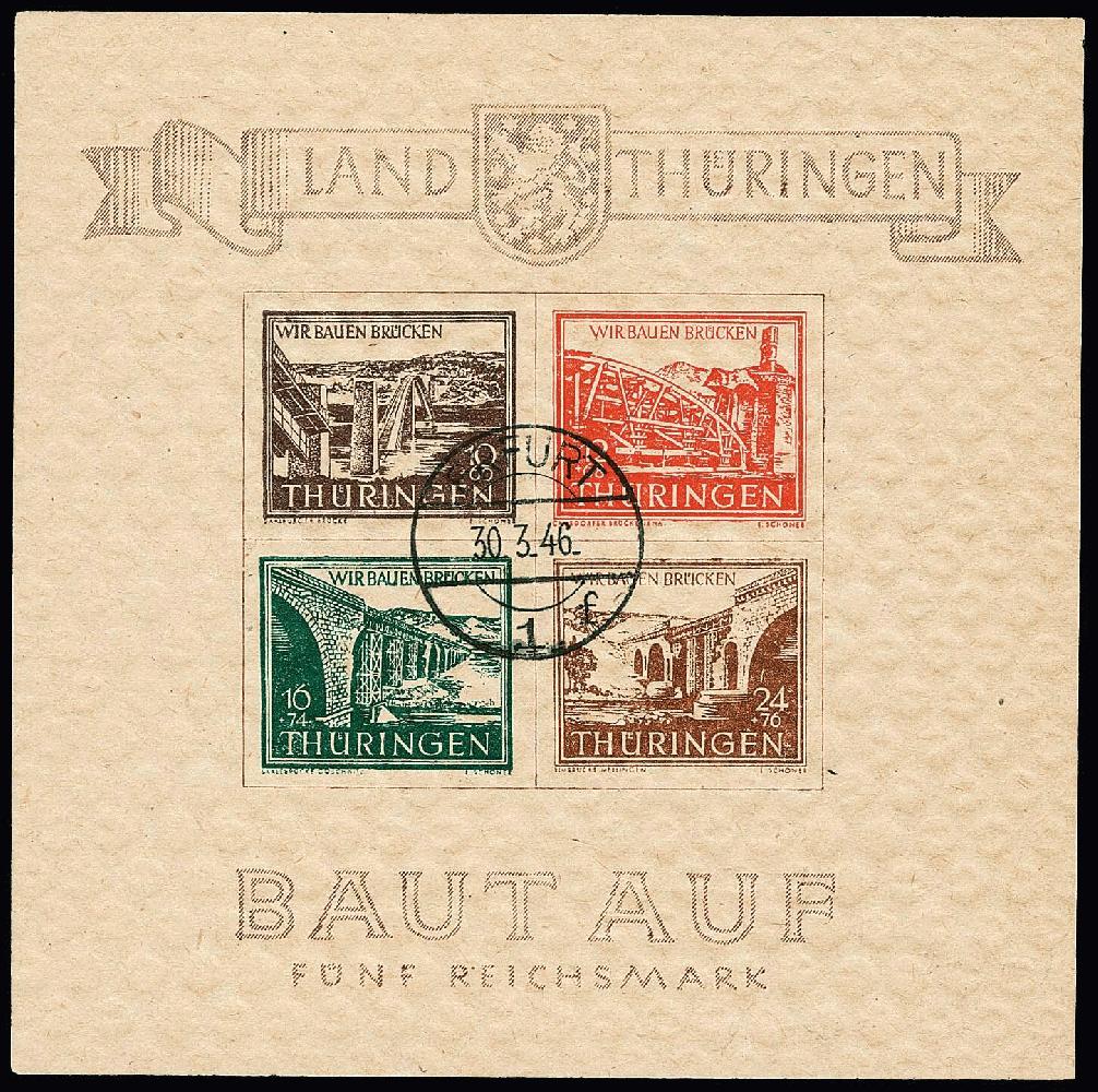 | Zusatzinformationen und Suchstichworte: | Rauhut & Kruschel - 219. Auktion 29. Juli 2023 Los 4318 Sowjetische Zone Brückenbau-Block in der guten Variante mit 12 Pfg. in Farbe dunkelzinnober, zentrischer Ersttagsstempel von Erfurt, 30.3.46. Rechts am Rand ein 1mm großer winziger Spalt und links unbedeutend gerundete Ecken (siehe Foto, belanglos) Ausruf 380,00 EUR |