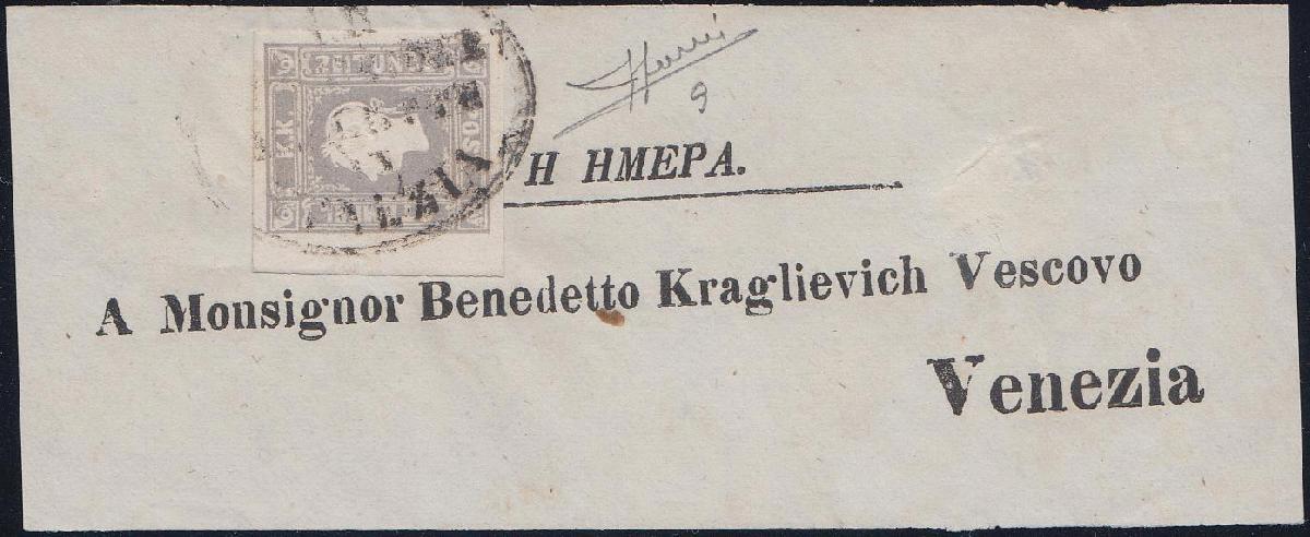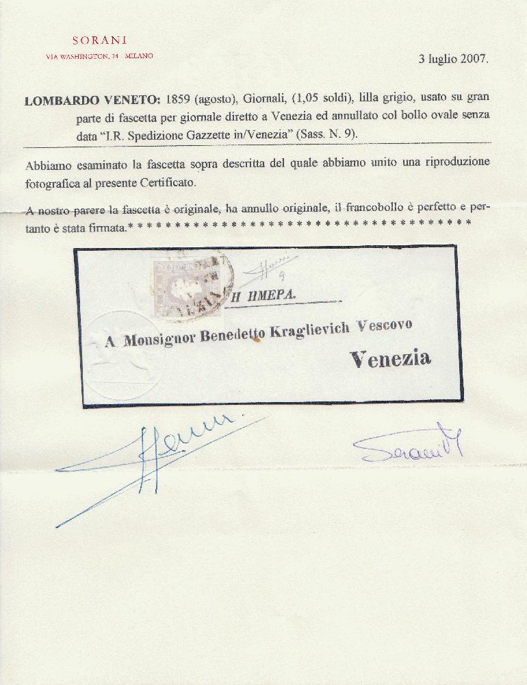 | Zusatzinformationen und Suchstichworte: | I Imera (Greek: Η Ημέρα, English: The Day) is a newspaper that is based in Patras in the Achaea regional unit in Greece. Its editor-in-chief is Theodoros Kamperos. https://en.wikipedia.org/wiki/I_Imera Versuch der Übersetzung: Lombardo Veneto: 1859 (August), Zeitungsmarke, (1,05 Soldi), fliedergrau, auf einem großen Teil der Schleife für nach Venedig gerichtete Zeitungen verwendet und mit ovalem Stempel ohne Datum "I.R. Spedizione Gazzette in/Venezia" (Sass. N 9). Wir haben die oben genannte Schleife geprüft, von der wir eine fotografische Reproduktion mit diesem Zertifikat kombiniert haben. Unserer Meinung nach ist die Schleife original, hat einen Originalstempel, die Marke ist perfekt und daher wurde sie signiert. |
