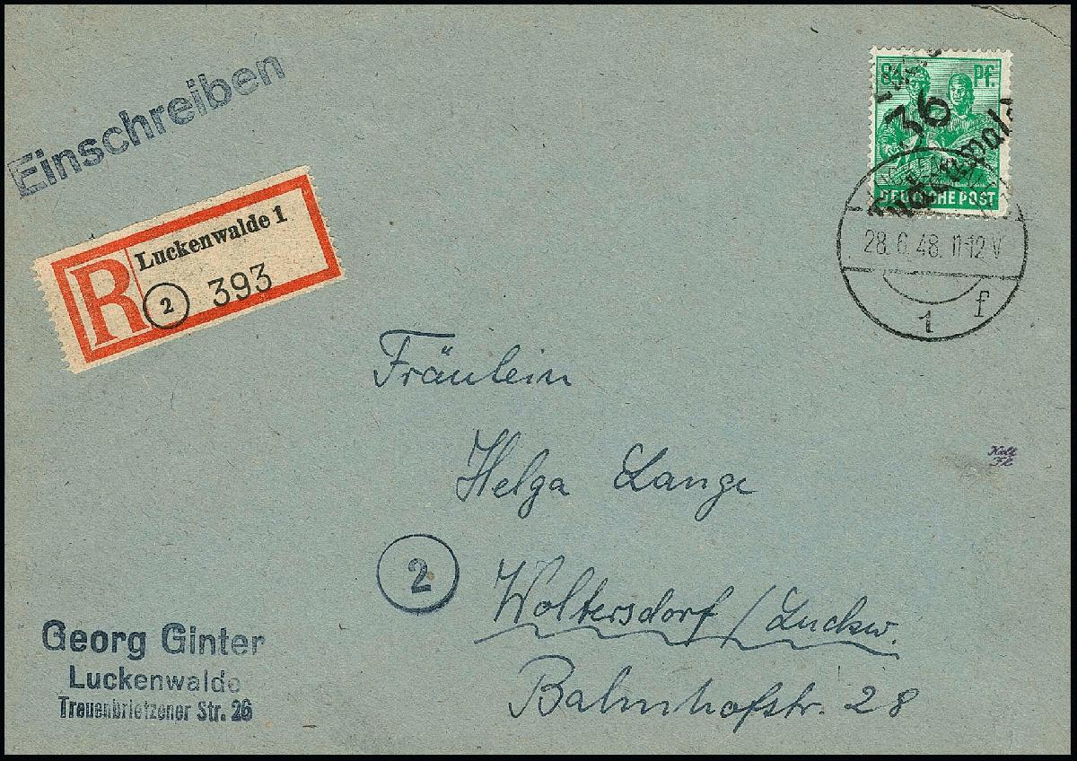 | Zusatzinformationen und Suchstichworte: | Rauhut & Kruschel - 219. Auktion 29. Juli 2023 Los 4407 Sowjetische Zone "36 Luckenwalde", 84 Pfg. Arbeiter, tadellos, als Einzelfrankatur auf Bedarfs-R-Brief aus Luckenwalde, 28.6.48. Die 84 Pfg. ist im Bezirk 36 sehr selten, nur wenige Belege bekannt Ausruf 1.200,00 EUR |