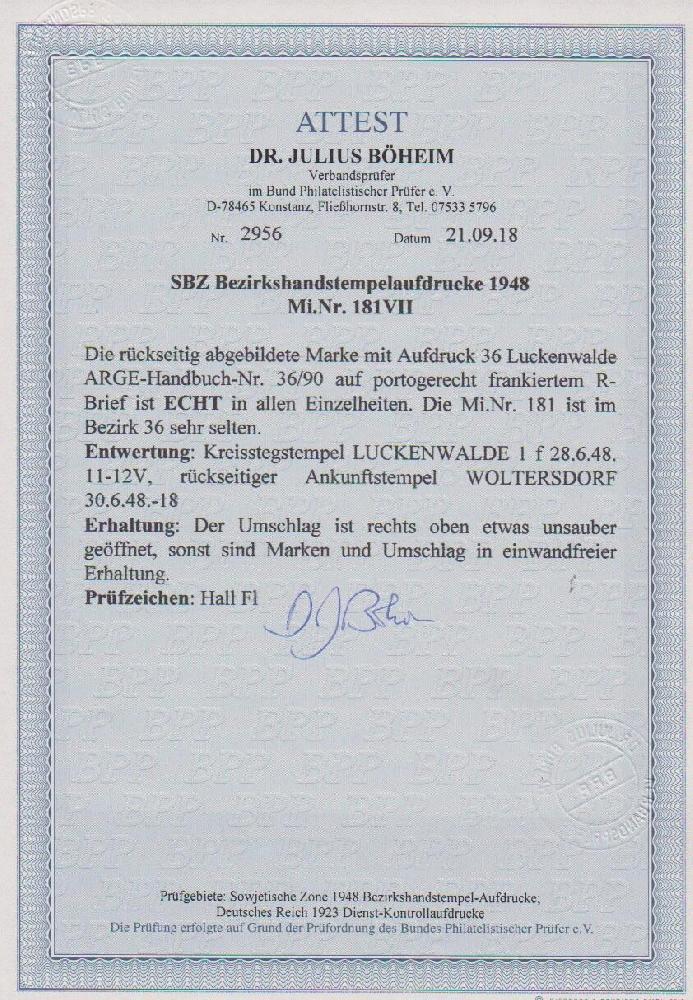 | Prüfgebiet: | Alliierte Besetzung SBZ Bezirkshandstempel Bezirk 36 |